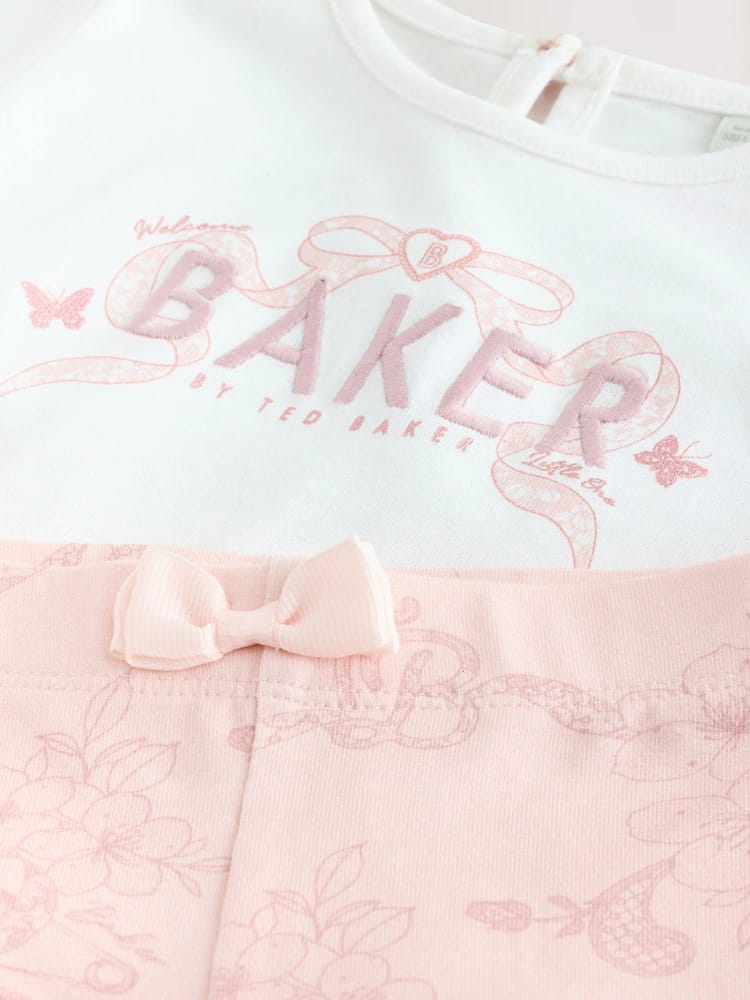 This Baker by Ted Baker two-piece set perfectly captures our signature elegance and playful designs. The outfit centers around a crisp white cotton T-shirt which features a broderie back panel, which travels into a peplum design around the hem. Adorned with delicate Baker embroidery and subtle foil branding on the chest. Complementing the top are soft jersey leggings in a beautiful soft pink, showcased by a our baby bunny print. Designed for both comfort and style for your little one, this coordinated ensemble offers a polished look that transitions effortlessly from play dates to casual outings.