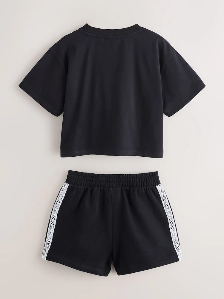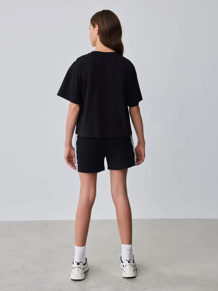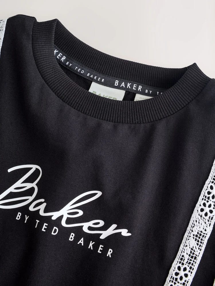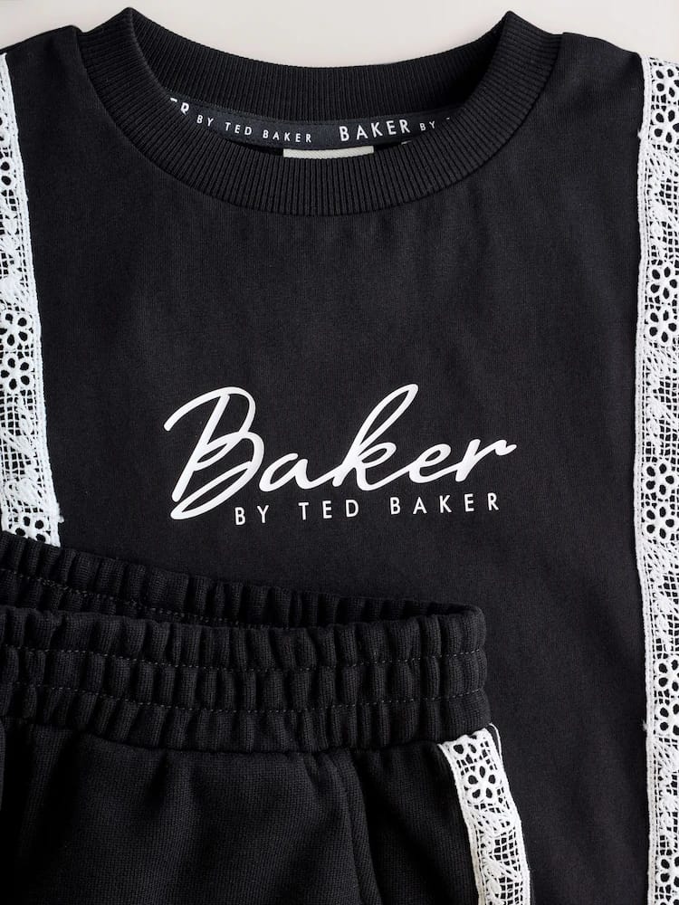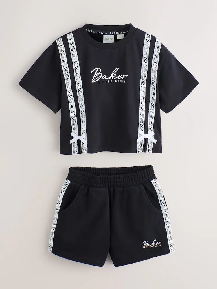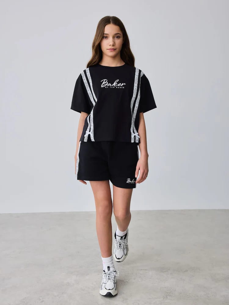 Ready for weekends out with this trendy 2 piece set from Baker by Ted Baker. This set offers a complete, coordinated look that balances athletic comfort with high-end designer details. The set is crafted from a soft cotton-blend jersey, featuring a relaxed boxy T-Shirt and sweat shorts. The set is designed with a a trendy double trail of Baker branded lace down the front and sides of the pair, finished with 3D bows at the hem and our Baker printed chest branding. The shorts feature functional pockets and our Baker branding at the leg. Pair with our Baker trainers for the ultimate cool-girl sporty look!