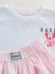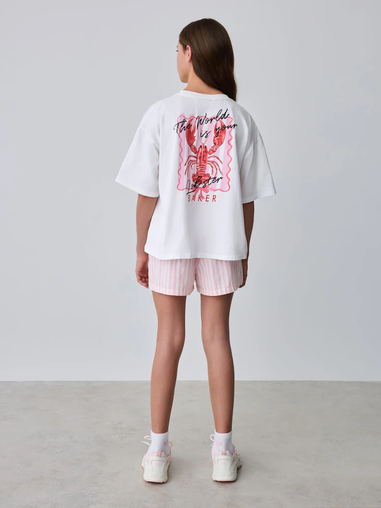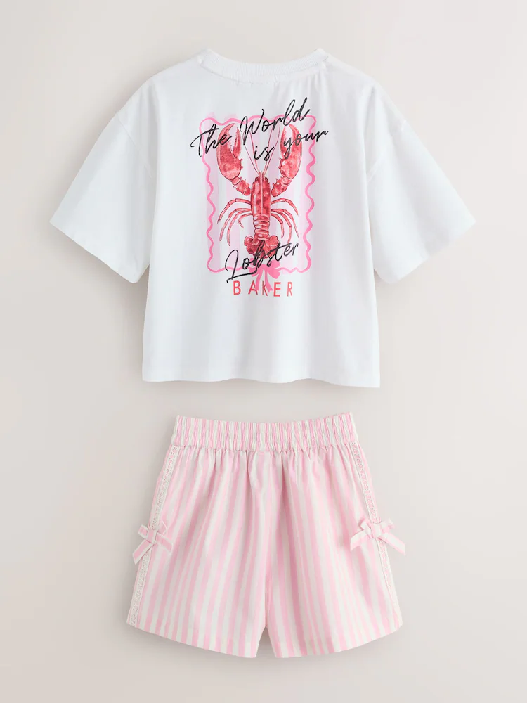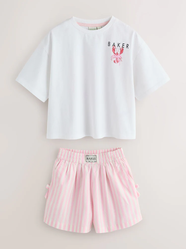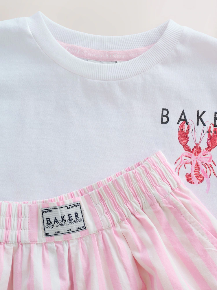 Bring a touch of coordinated charm to her summer wardrobe with this Baker by Ted Baker two-piece set. The ensemble features a crisp white cotton T-shirt with a relaxed oversized fit, elevated by our bold Baker lobster graphic on the chest, which mirrors on a larger scale at the back. Perfectly paired with the cotton poplin candy-striped shorts in a soft pink and white palette. Designed for both style and ease, the shorts feature branded tape down the side seams along with 3D woven bows. The shorts also feature functional pockets and a comfortable elasticated waistband adorned with our iconic Baker woven badge. Whether she’s exploring on holiday or enjoying a family garden party, this set offers a fresh, designer-led look that doesn’t compromise on comfort.