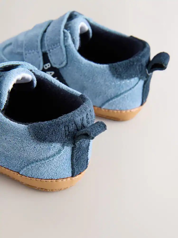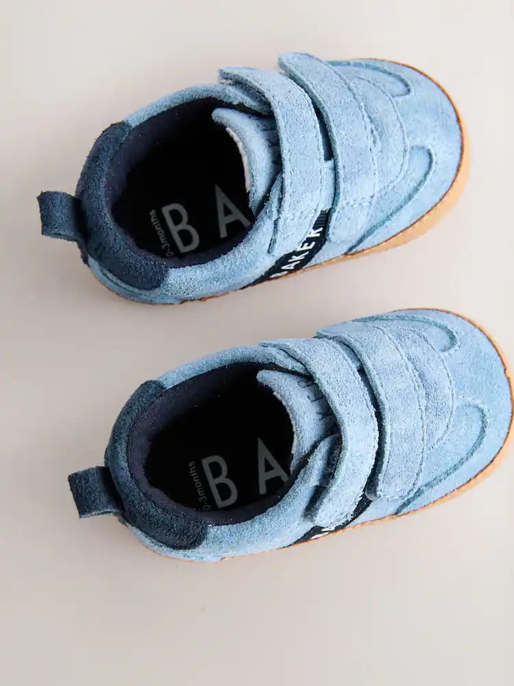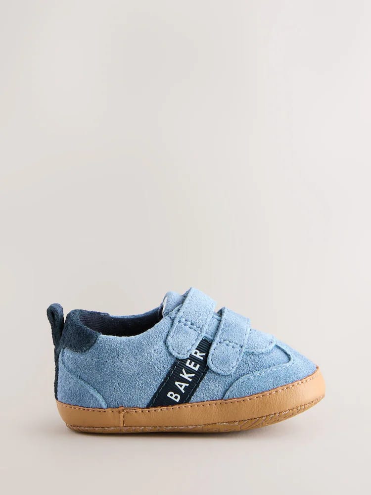 Crafted with a soft blue suede upper, these trainer padders from Baker by Ted Baker combine an on-trend look with a comfortable design for little feet. This classic style features a mock gum sole and a soft cushioned sole to provide a gentle foundation. Practical design elements include a double touch and close fastening for easy dressing, along with a navy heel tab and contrasting navy branded Baker tape across the sides. Signature Baker branded trims complete the look, making these a charming and functional choice for everyday wear.