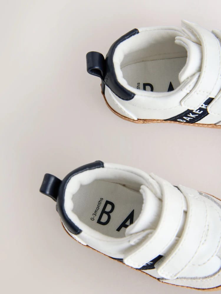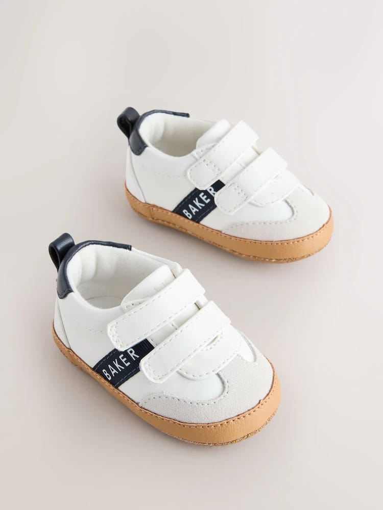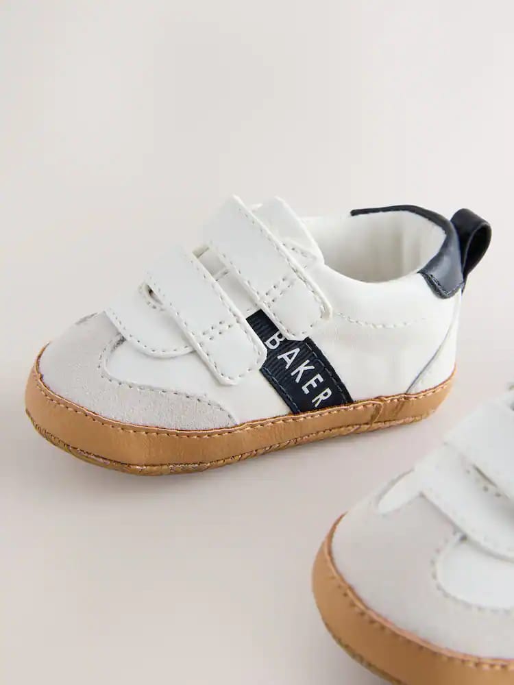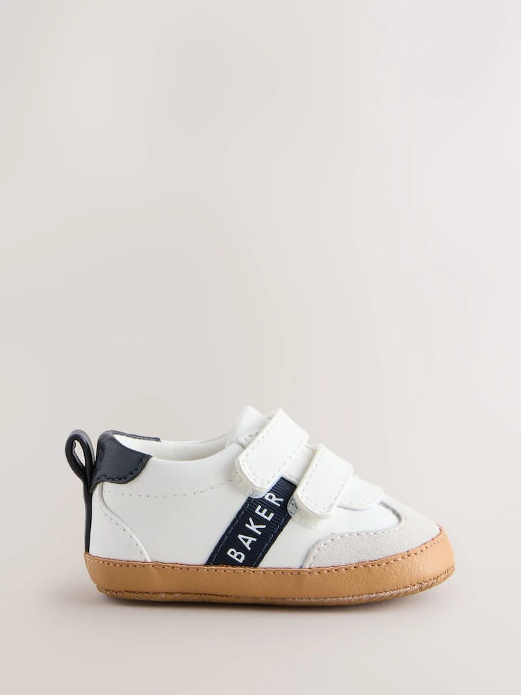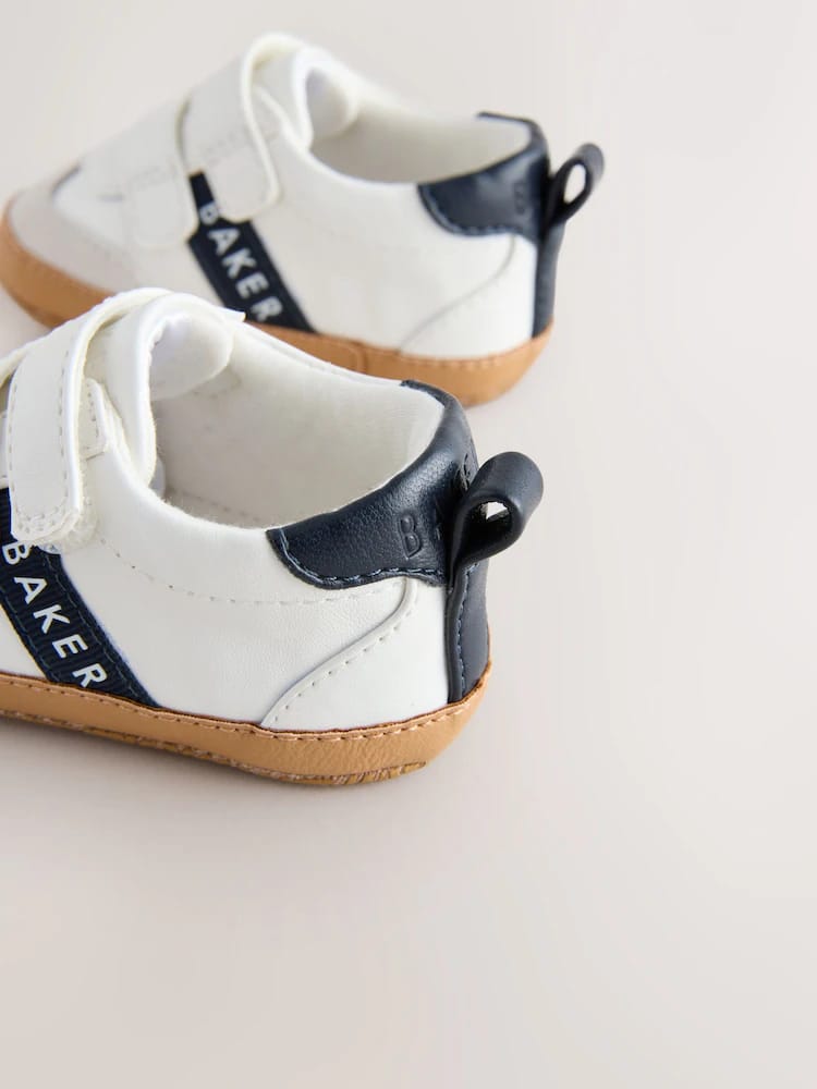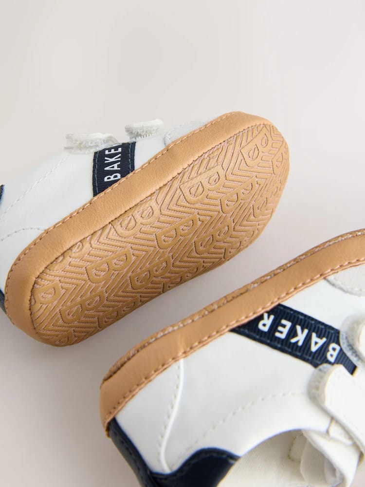 Crafted with a crisp white upper, these trainer padders from Baker by Ted Baker combine an on-trend look with a comfortable design for little feet. This classic style features a mock gum sole and a soft cushioned sole to provide a gentle foundation. Practical design elements include a double touch and close fastening for easy dressing, along with a navy heel tab and contrasting navy branded Baker tape across the sides. Signature Baker branded trims complete the look, making these a charming and functional choice for everyday wear.