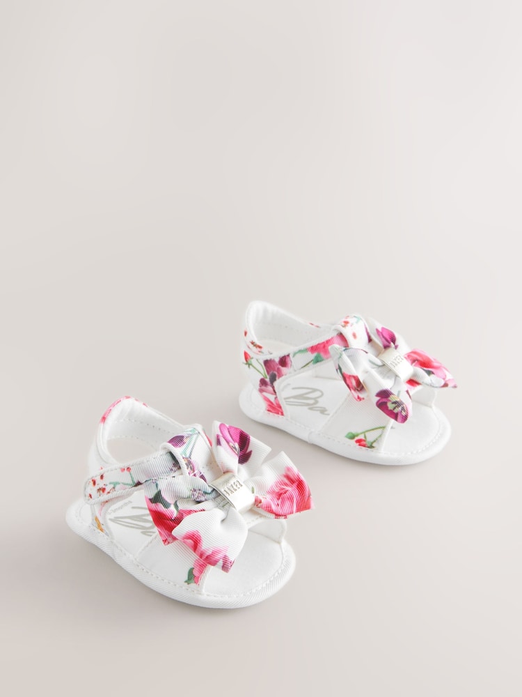 Designed with an all-over floral print, these baby occasion padders sandals from Baker by Ted Baker are perfect for summer months and to pair with her pretty Baker dress. A matching grosgrain bow on the front adds a sweet, decorative touch, while the touch and close fastening ensures easy dressing and a secure fit. These charming sandals are finished with a soft cushioned sole to keep little feet comfortable during special events.