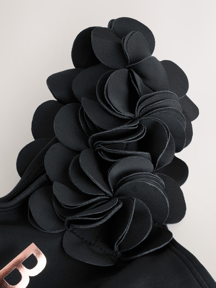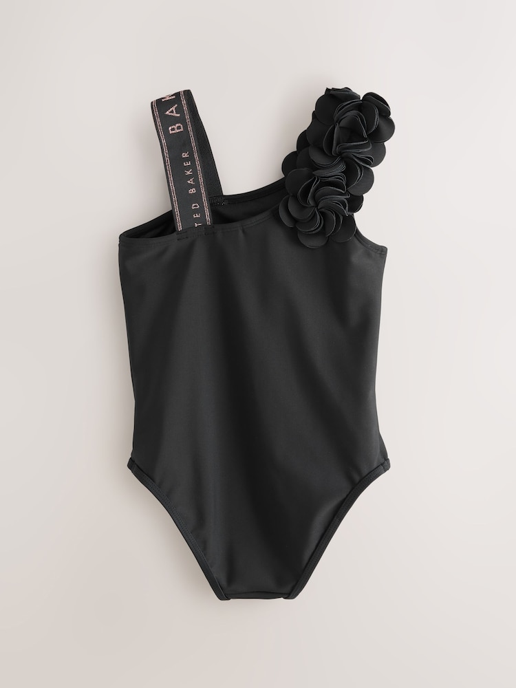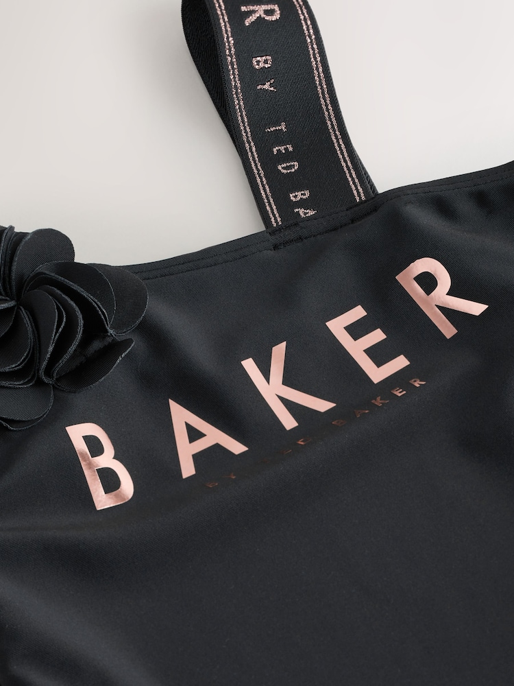 Get her ready for the heat with this pretty 3D floral swimsuit from Baker by Ted Baker. This gorgeous holiday staple comes in black, featuring a 3D flower strap on one side, complimented by our Baker rbanded lurex strap on the other. Finishing details include our iconic Baker branded in gold foil across the chest. Pair with our kaftan and sandals to get her ready for the sun!