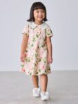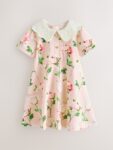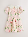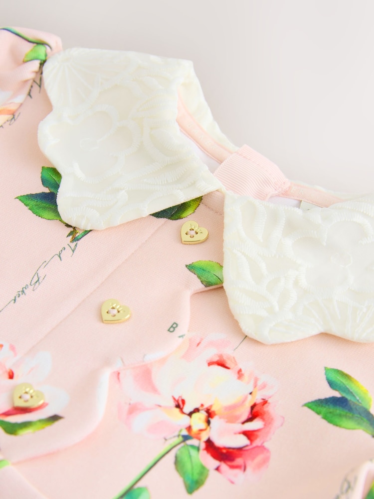 A timeless piece perfect for any cherished event. This exquisite dress is crafted in a soft ponte fabric in a rich pink all-over floral, with a soft structure that ensures a graceful drape. The defining feature is the scalloped collar, intricately detailed with delicate lace embroidery. The dress is finished with our Baker branded gold-tone heart buttons down the bodice. With its gentle A-line cut and sophisticated short sleeves, this dress is designed to be an heirloom piece.