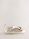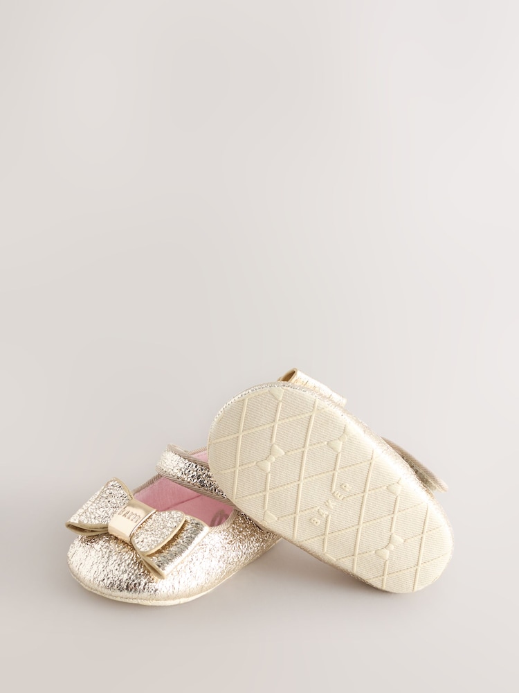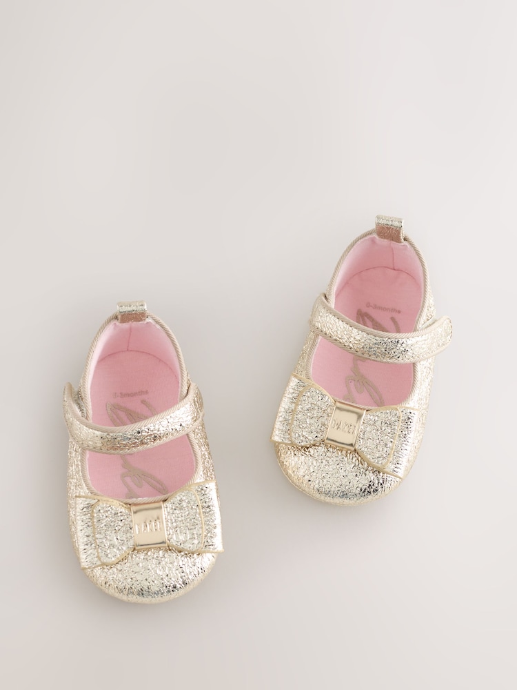 Add a touch of designer elegance to her earliest outfits with these Baker by Ted Baker Baby Padders Shoes, designed in a charming Mary Jane silhouette. These sweet metallic gold padders feature a pretty matching bow and a gold-tone branded trim, paired with a classic ballet pump toe. Prioritising comfort for delicate feet, they are crafted with a soft cushioned sole and a secure touch and close fastening for easy dressing. Finished with signature Baker branded trims, these beautiful shoes are the perfect finishing touch for any special occasion.