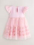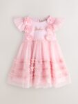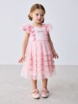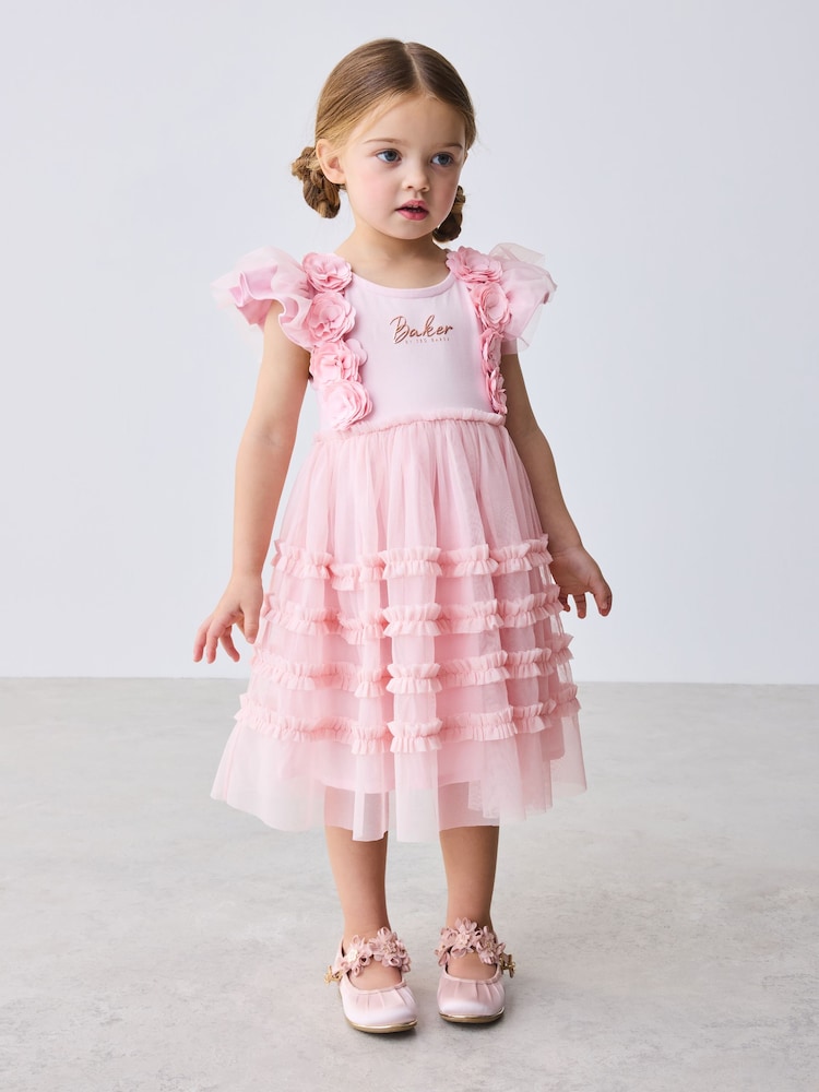 She’ll look pretty as a princess with this enchanting corsage dress from Baker by Ted Baker. Crafted in a delightful baby pink, this dress showcases a soft jersey bodice combined with stunning 3D fabric corsages that frame the iconic Baker by Ted Baker rose gold script on the chest. The skirt is a true showstopper, featuring multiple layers of voluminous, soft tulle with playful, tightly ruched ruffles creating dramatic tiers. Finished with delicate tulle ruffle sleeves and our Baker-branded rose gold rim button, this dress is guaranteed to make her feel like royalty at any celebration.