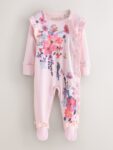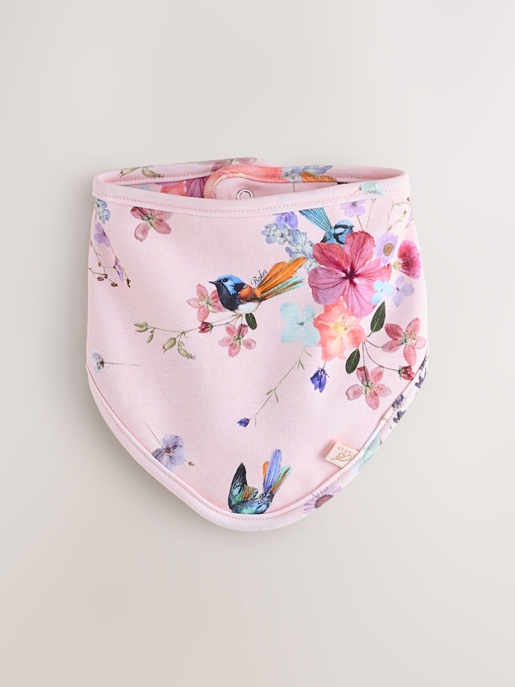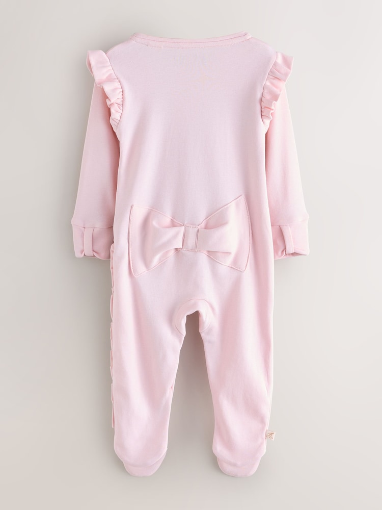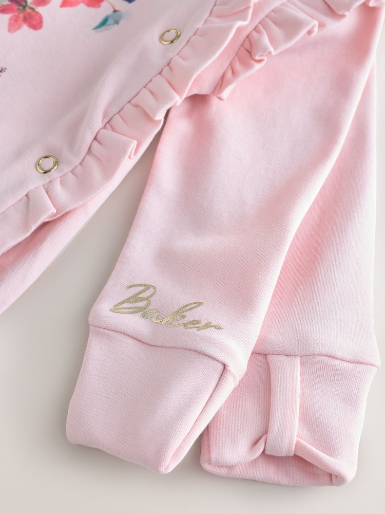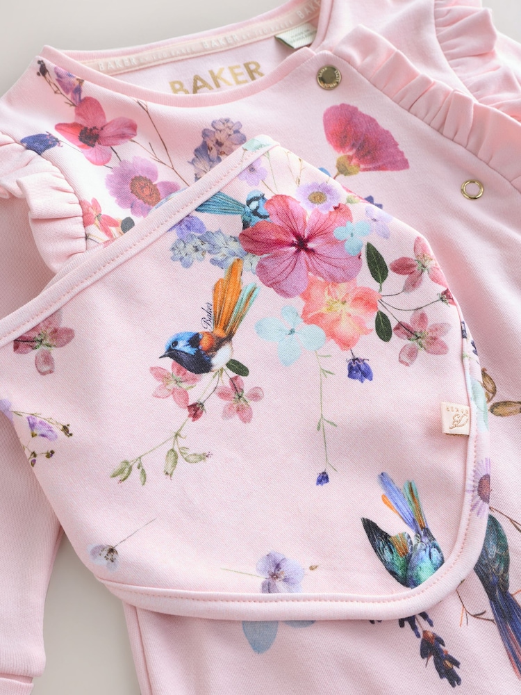 Welcome her into the world with this adorable sleepsuit and bib set from Baker by Ted Baker. The sleepsuit set comes in a soft cotton fabric with a printed floral design, soft frilly detailing along the shoulders and edge of the bib, and button popper fastening. Also featuring pink grosgrain bows at the feet, printed B for Baker at the bottom of the feet in gold foil, and a self-fabric bow design placed on the bottom.