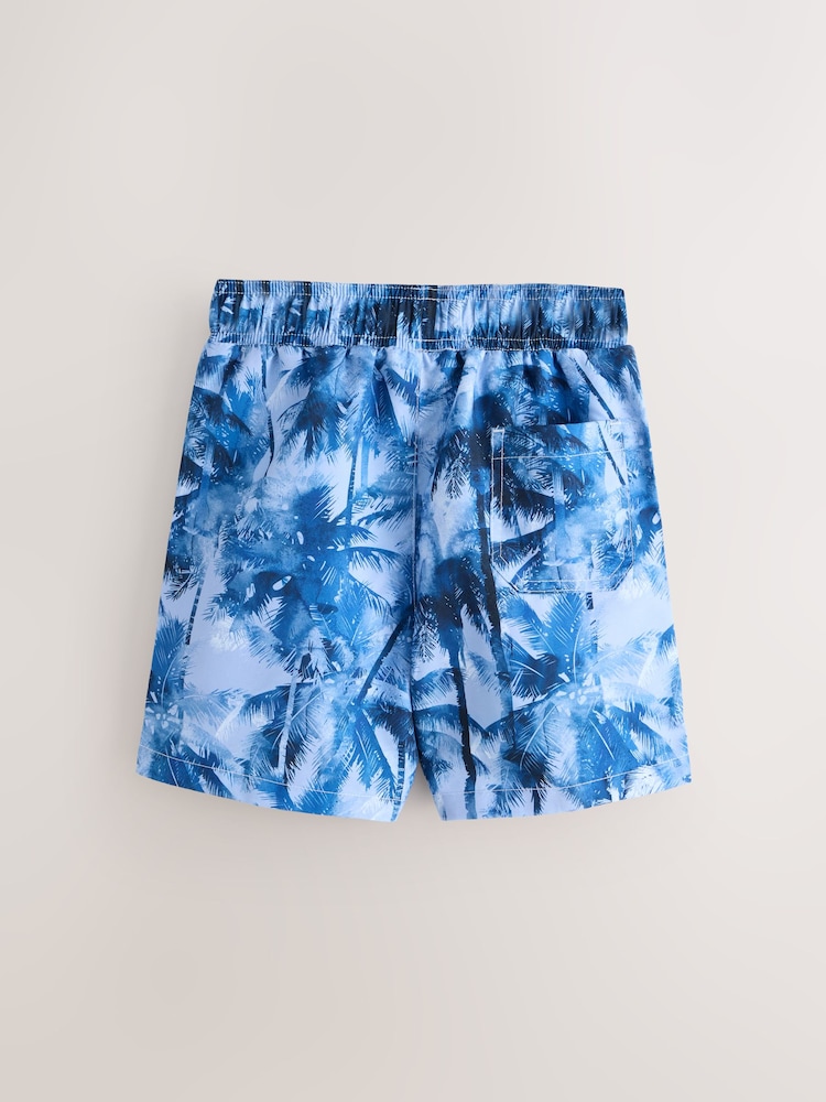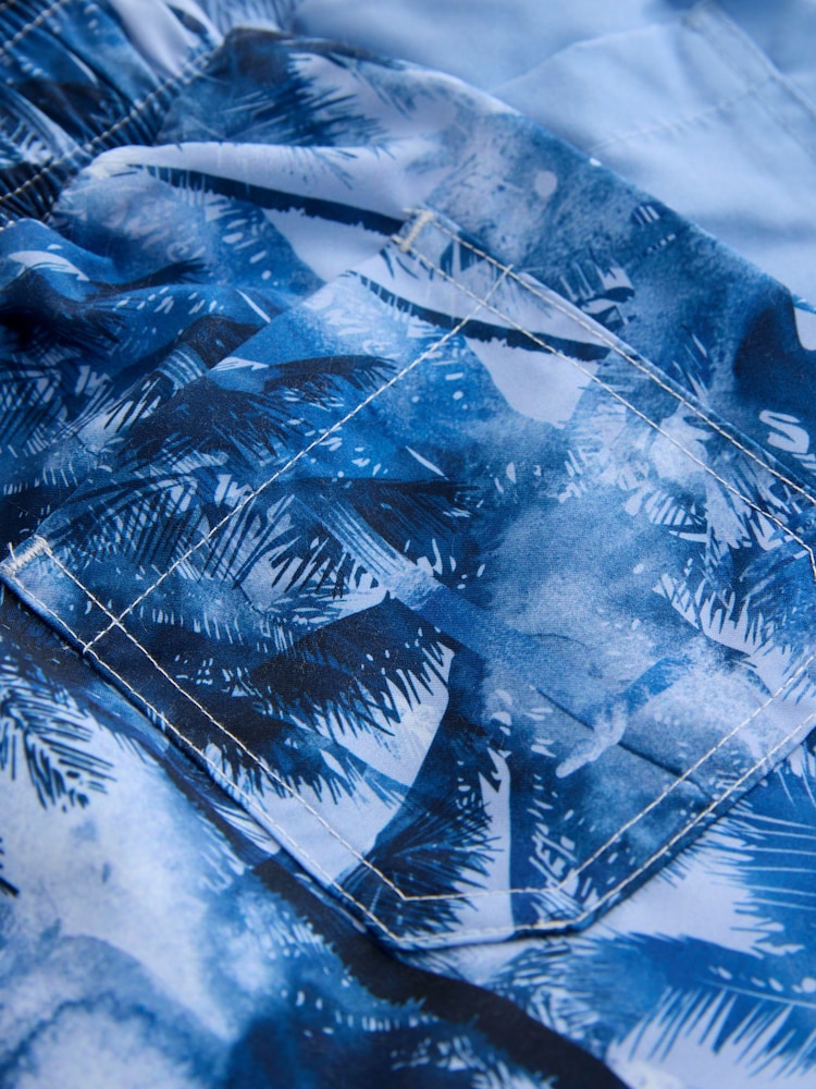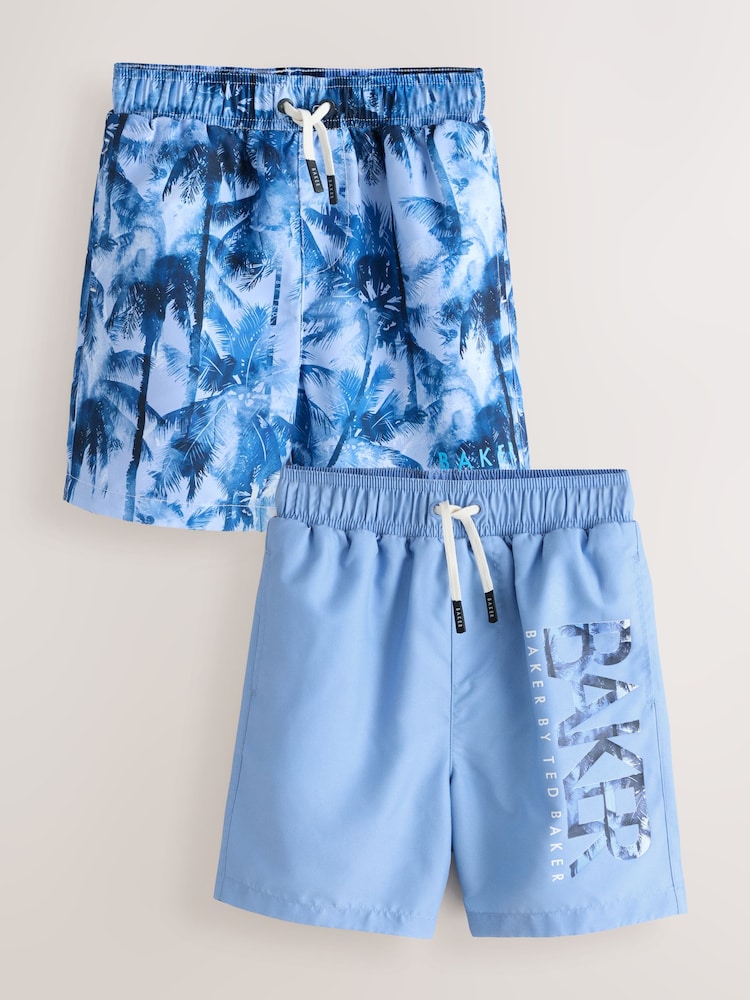 Get set for pool days and beach adventures with the Baker by Ted Baker Swim Shorts 2-Pack, featuring two distinct and stylish designs. This set includes one pair with a vibrant, all-over palm tree print in shades of blue, accented with subtle Baker branding near the hem. The second pair comes in a clean, solid blue with bold, vertical Baker by Ted Baker branding prominently displayed down the side. Both pairs are designed for a comfortable and secure fit, featuring an elasticated waistband with branded eyelets and a contrast drawcord, along with a practical back pocket.
