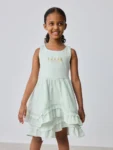 Ready for summer with this elegant multi-tiered cotton poplin dress from Baker by Ted Baker. This summer staple is a beautiful blend of charm and refined summer style. Featuring a soft rib body with a cotton poplin skirt, the dress is elevated with a racer back design and 3D cotton bow on the back. The structured flowy tiers give way to a breezy skirt, finished with our Baker branded woven trim and high-low hem. Finished with Baker gold foil embroidery, this is the perfect piece for seaside holidays or a formal summer event.