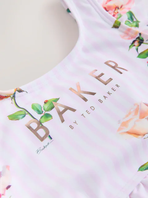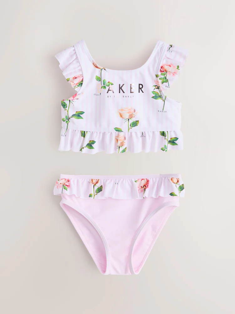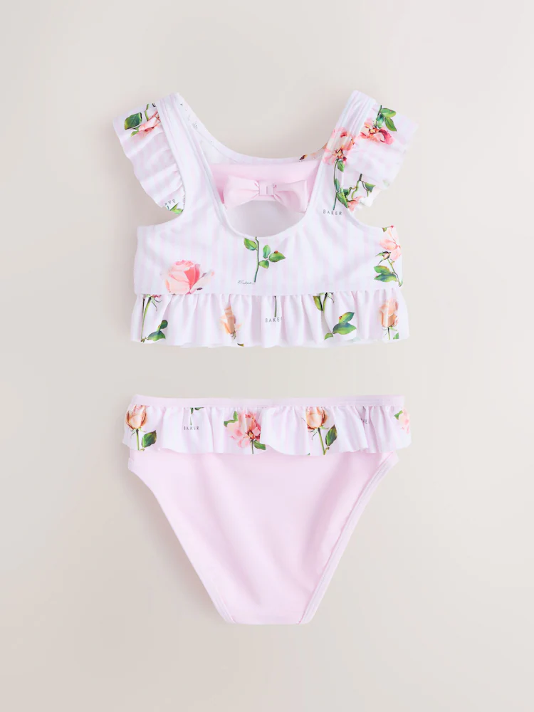 Bring a touch of elegance to her poolside wardrobe with this gorgeous two-piece bikini set from Baker by Ted Baker. Combining our iconic florals with playful silhouettes, this set is a must-have for summer fun. The bikini top features a pretty pink and white stripe decorated with a romantic rose print, finished with signature gold foil Baker branding. Fluttery ruffle straps and a peplum-style frilled hem add a voluminous touch, with finishing details being an elasticated open back with a bow. The coordinating bottoms offer a beautiful contrast in a soft solid pink, topped with a matching floral ruffled waistband for a pretty and fun look. Pair with Baker flip flops for the ultimate summer outfit.