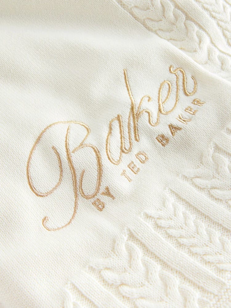 Wrap up your little one in comfort and style in this charming baby blanket from Baker by Ted Baker. The soft cream blanket features an adorable cable knit trim design with little knitted bows and gold thread Baker embroidery. This will make a charming gift for your new addition.