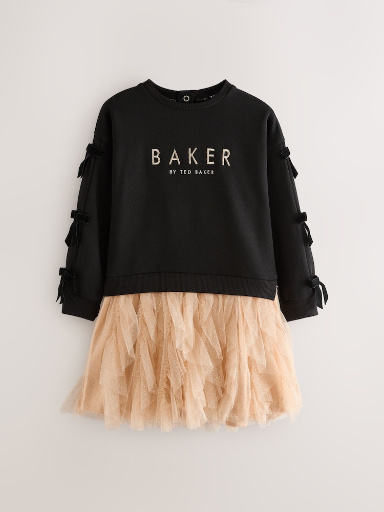 Style her in newness from Baker by Ted Baker with this pretty ruffle mesh mockable dress. This dress is made in a soft brushback fabric for the sweat, whilst the skirt is crafted from a soft mesh with multiple tiers and ruffles. The top features satin 3D bows down the front chest, complimented with satin embossed Baker branding. Pair with her favourite trainers or boots to elevate her look.