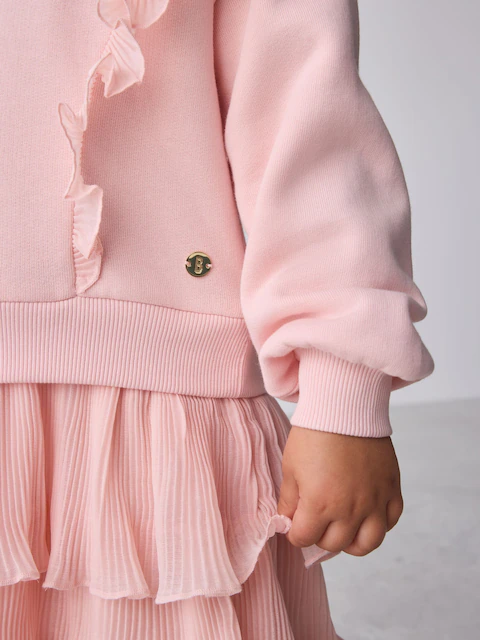 Pretty in pink, she’ll look adorable in this mesh mockable dress from Baker by Ted Baker. This dress comes in a soft brushback fabric mix, with a beautiful soft crinkle mesh mockable skirt with multiple tiers. The dress also features frill details on the shoulders. It also includes the iconic gold foil Baker branding on the chest, finished with a branded gold button keyhole opening at the back neck. Perfect for party time!