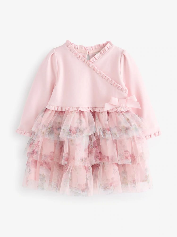 Dress your little one in this adorable pink wrap tulle dress from Baker by Ted Baker. The mockable design boasts a soft wrap bodice complemented with a matching mesh tulle skirt. It is finished with a charming bow detail on the side.