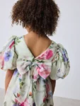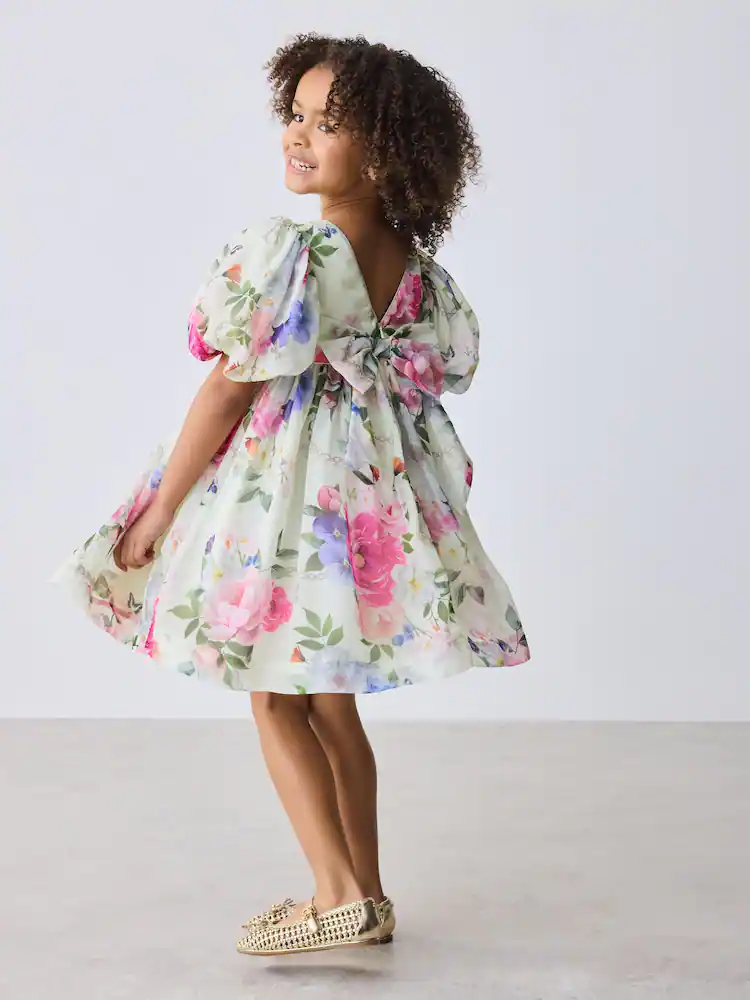Capturing the essence of spring, this Baker by Ted Baker dress is the ideal choice for any special occasion. The design is crafted from a lightweight, airy organza that showcases a vibrant, large-scale floral prints. The silhouette is defined by its dramatic voluminous puff sleeves and a deep-V back, beautifully finished with an oversized 3D bow detail at the back that serves as a stunning focal point. Its full, flared skirt and soft-touch lining ensure both a high-fashion aesthetic and all-day comfort, making it a perfect piece for parties!