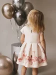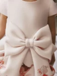 This Ballet Pink scuba occasion dress features a vibrant print and 3D bow detail. Crafted from a soft yet structured scuba fabric, it is designed for a polished look at special events.