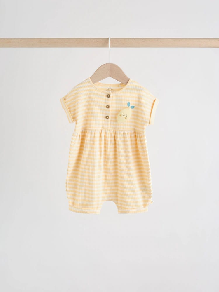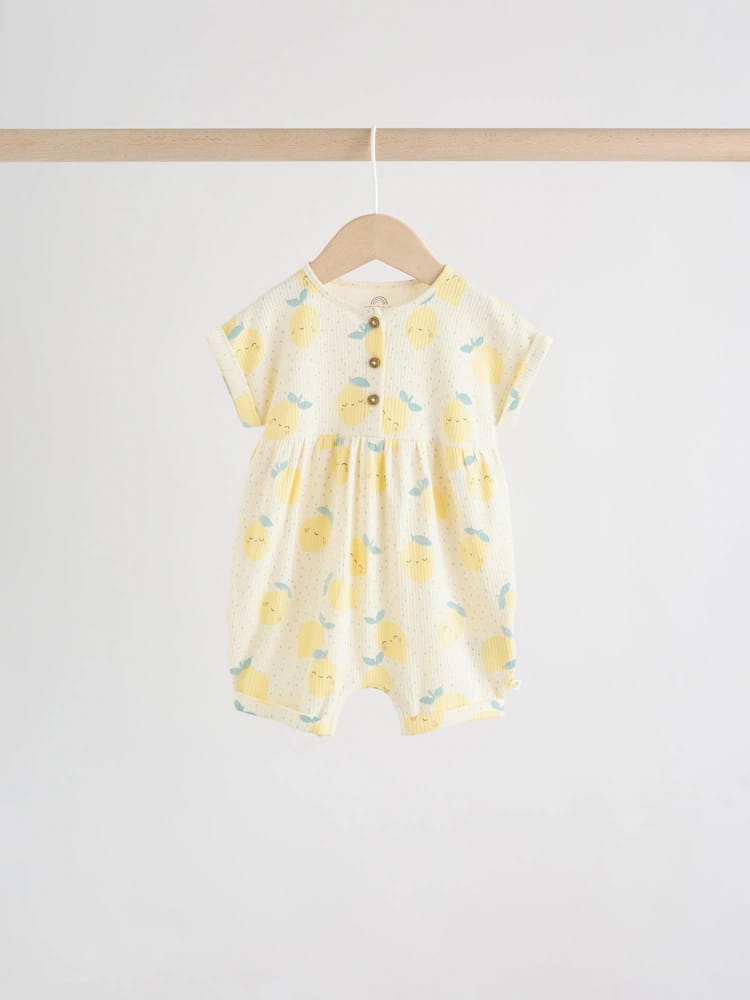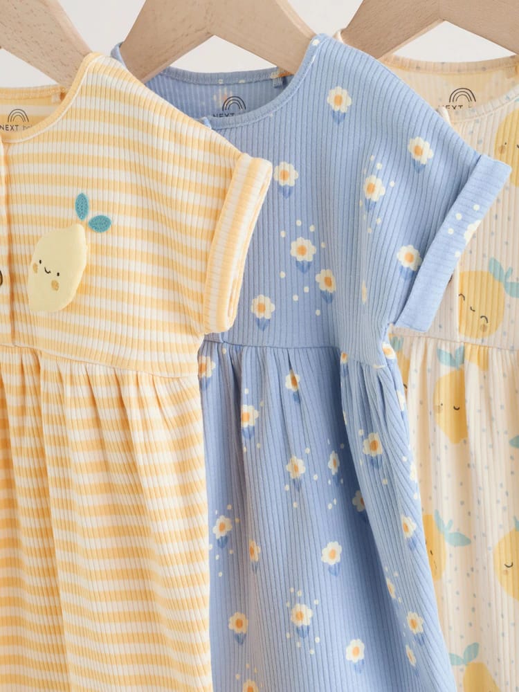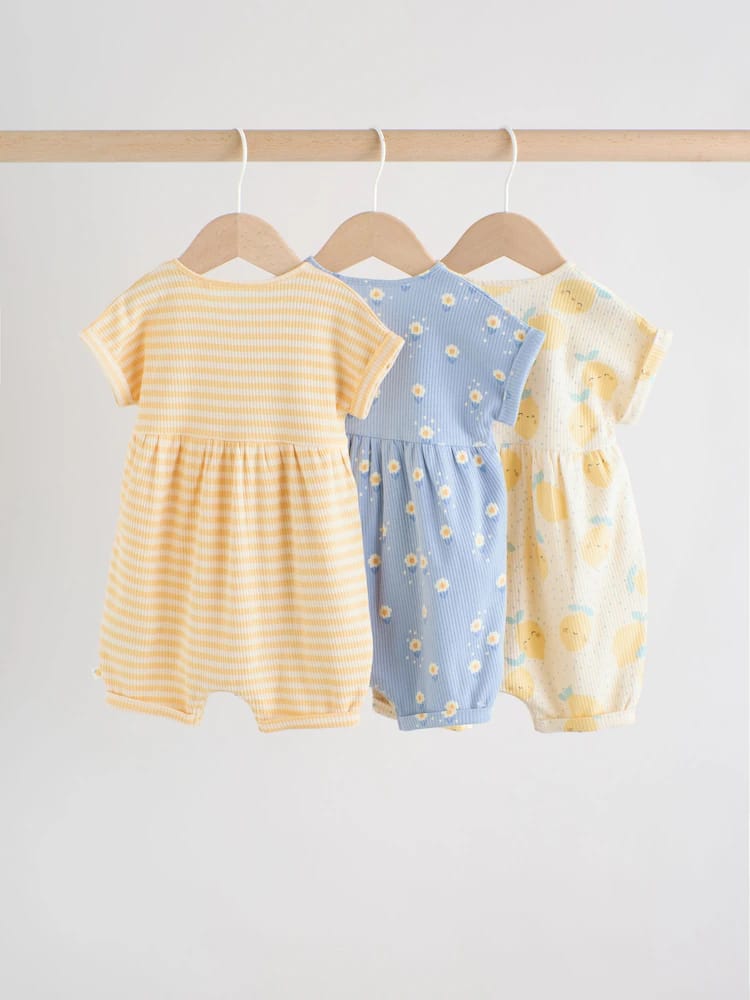 This charming Blue and Lemon Printed Button T Shirt Jersey 3 Pack Baby Rompers collection is perfect for your little one. The all over printed rompers feature wadded character chest embroidery, a mock wood button through fastening, a popper leg opening, and sweet woven side tabs.