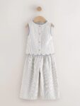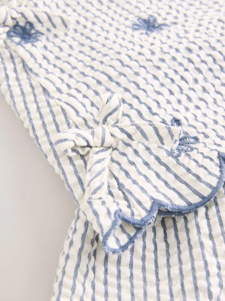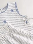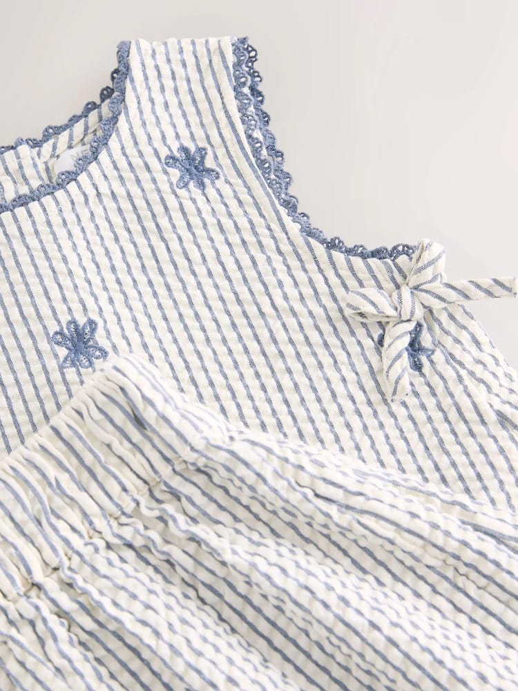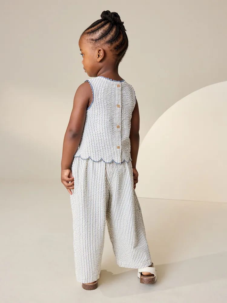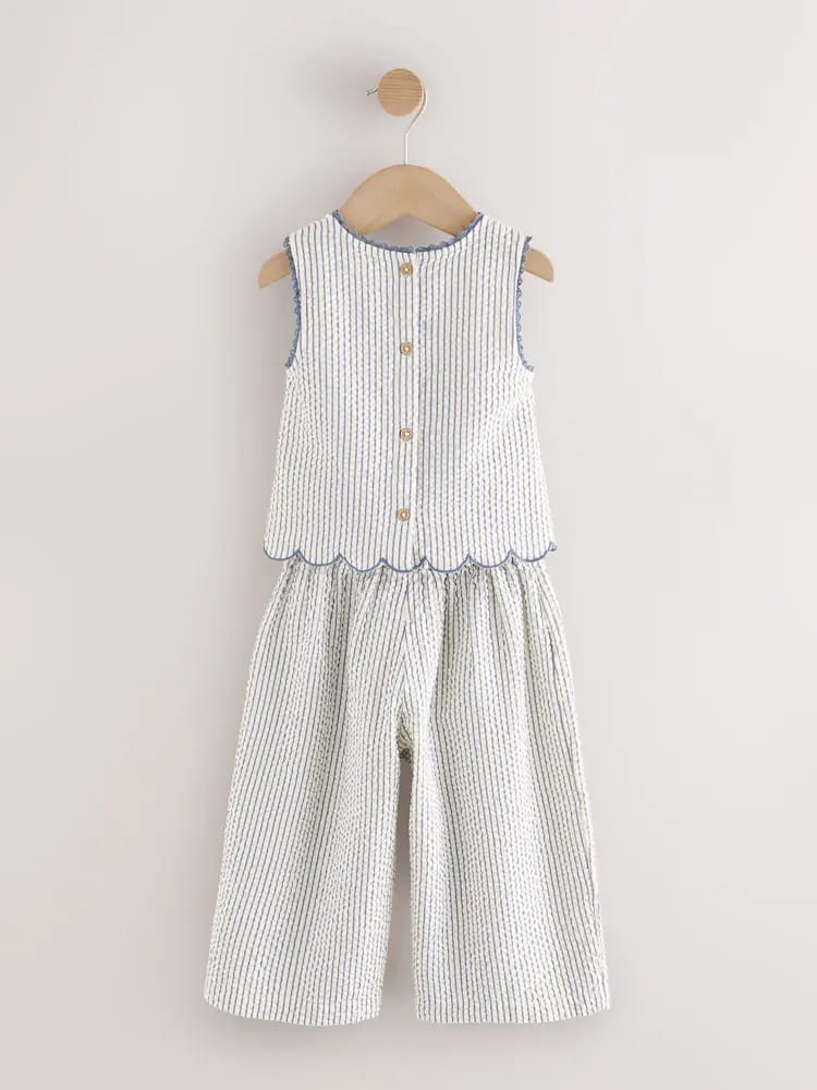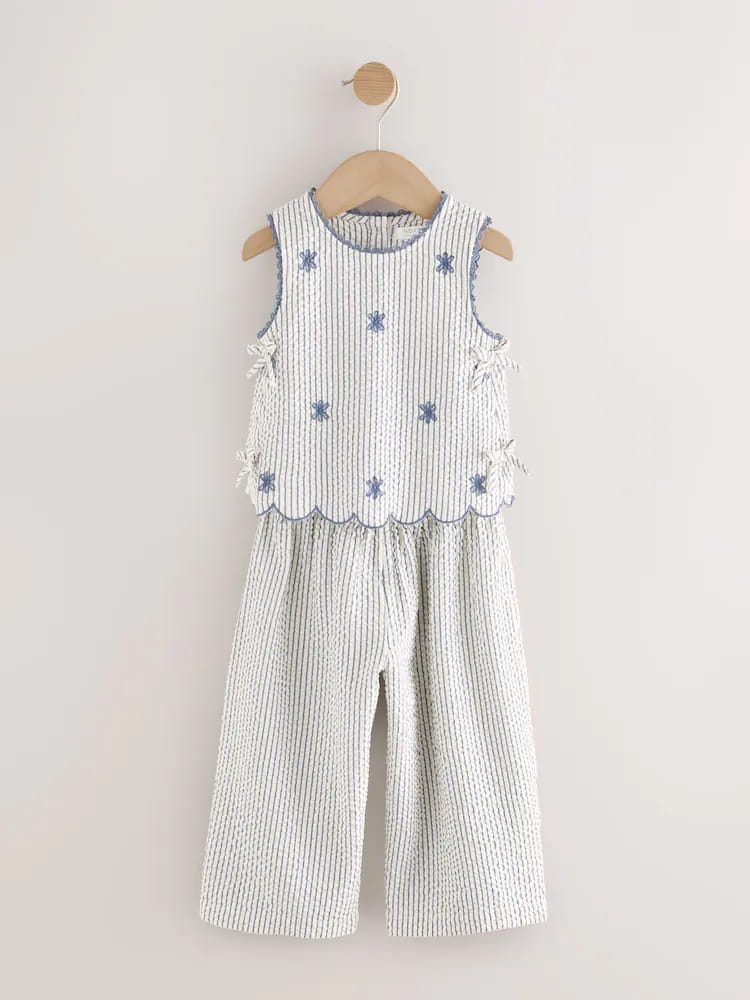 This charming two-piece set is perfect for sunny days. It is crafted from a breathable, textured seersucker fabric in a classic blue and white stripe, blending comfort with boutique-style details. The sleeveless top features sweet floral embroidery, navy scalloped edging, and playful side ties. It is paired with matching wide-leg culottes with an easy elasticated waistband, making it the perfect outfit for summer picnics and holiday adventures.