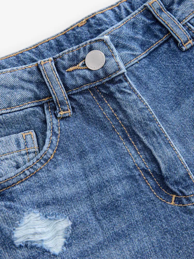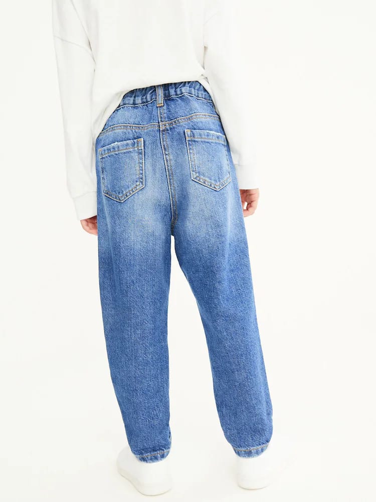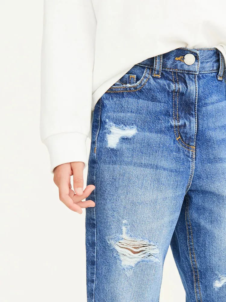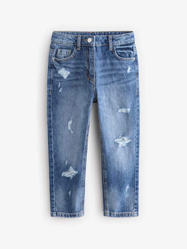 Wear them just like mama. In an on-trend mom shape, our mid blue distressed denim jeans are made from a lightweight and comfortable cotton denim with an elasticated back waistband for fit and comfort. Style with a simple top and box fresh trainers for a cool finish.