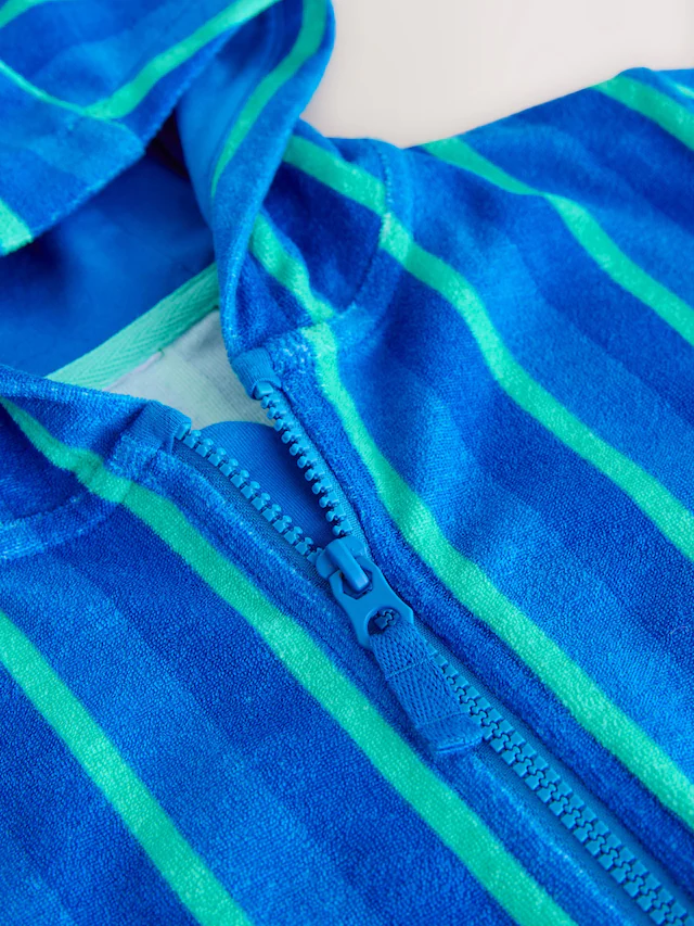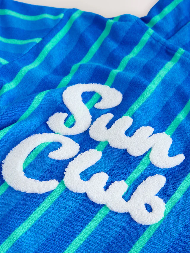 This blue and green striped cover-up is made from soft towelling fabric, designed for drying off after swimming. It features a functional zip-through front and a ‘Sun Club’ graphic on the back.