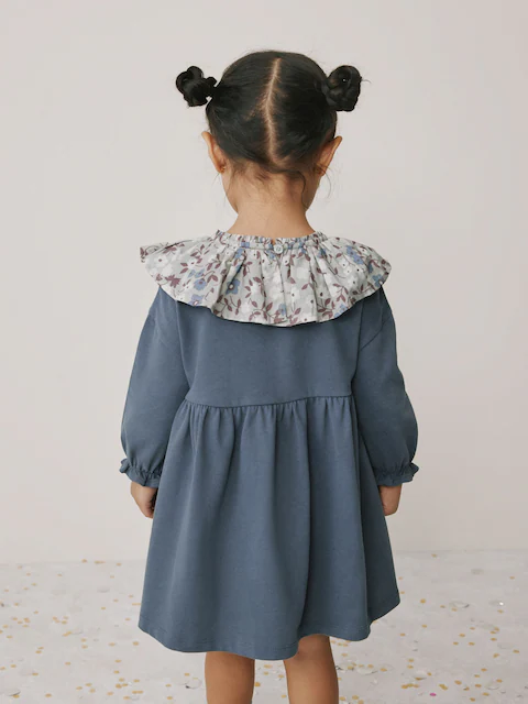Crafted from a soft, brushed fabric, this blue long-sleeve dress is perfect for any occasion. The stylish floral-print collar adds a charming contrast, while the long sleeves keep them cosy. This dress is a comfortable and fashionable choice for parties or special family outings.