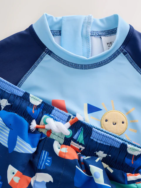 Keep your little one protected and comfortable with the Blue Sunsafe Rash Vest and Swim Shorts Set. This coordinated two-piece set features a playful nautical theme with a large whale and ship graphic on the rash vest and a matching all-over boat print on the shorts. For safety and peace of mind, the rash vest provides a protective UPF rating of 50+. Sizes for age 2 years and below include a zip at the back neck to simplify changing.