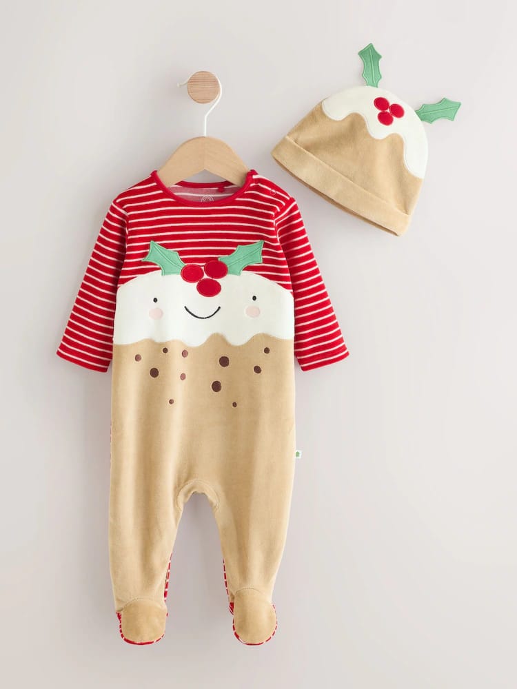 Get them ready for the festive season with this adorable brown baby sleepsuit. The soft and cosy fabric is perfect for keeping them comfortable, while the playful prints add a fun, festive touch. This set includes a matching hat to complete the look.