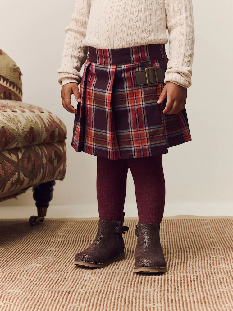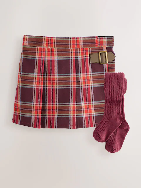 Perfect for a stylish and comfortable day out, this two-piece, burgundy-red set is a charming addition to any wardrobe. The check-print skort has an elasticated back waist for a comfortable fit, while the coordinating tights ensure a cosy finish.