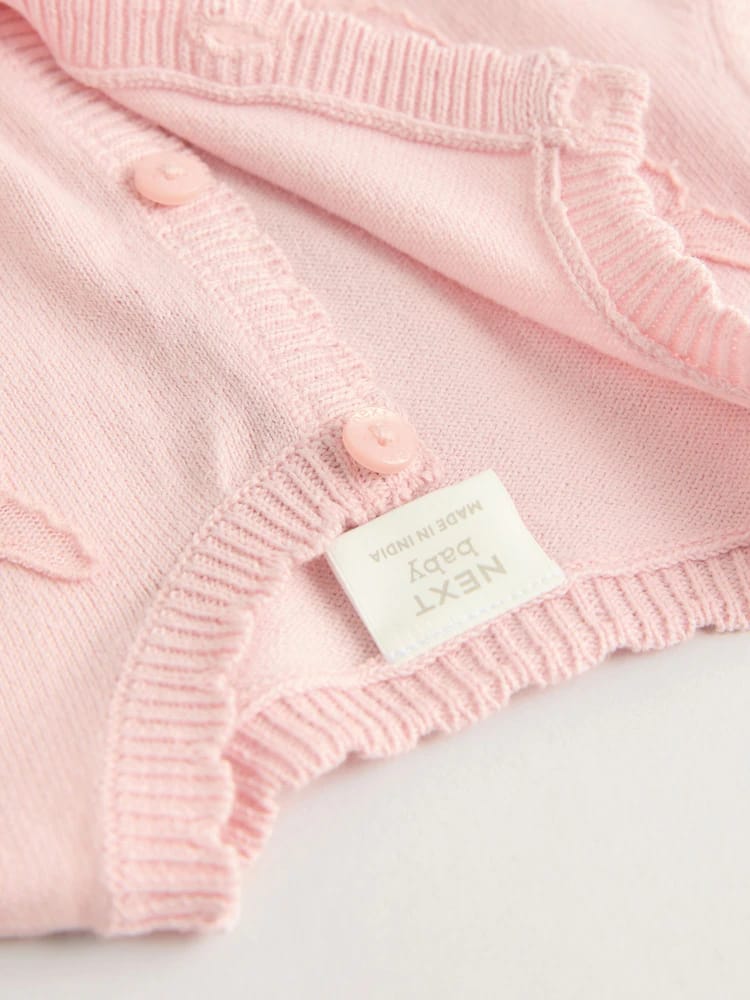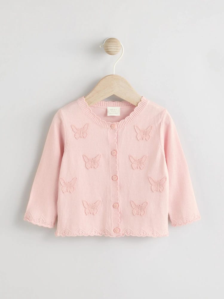 Made from a soft cotton-rich fabric, this pink cardigan is perfect for layering up, featuring a button-up front fastening, a ribbed and scalloped collar and a broderie hem, finished with all-over 3D butterfly embroidery.