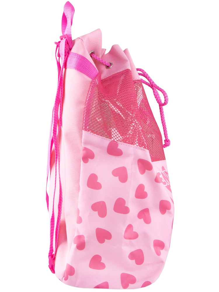 The background on the kids swimming bag features a lovely all-over print of pink hearts, adding a sprinkle of fun to every swim outing. Designed with little hands in mind, this swim bag kids will love features a drawstring closure and a convenient handle for easy carrying.