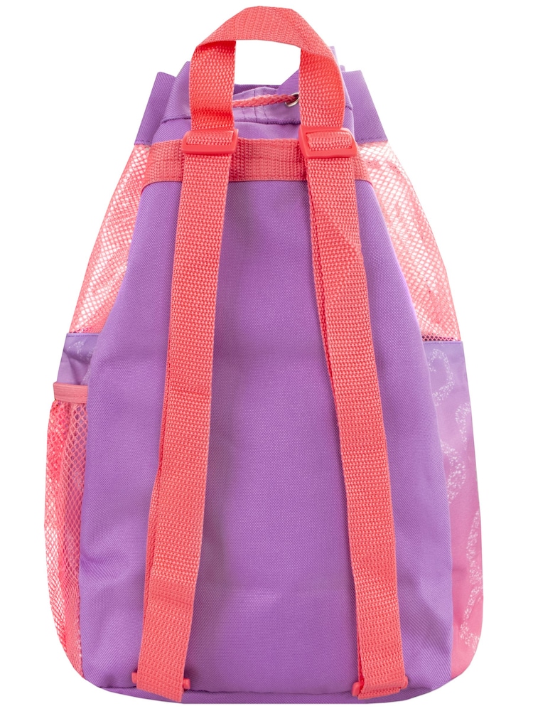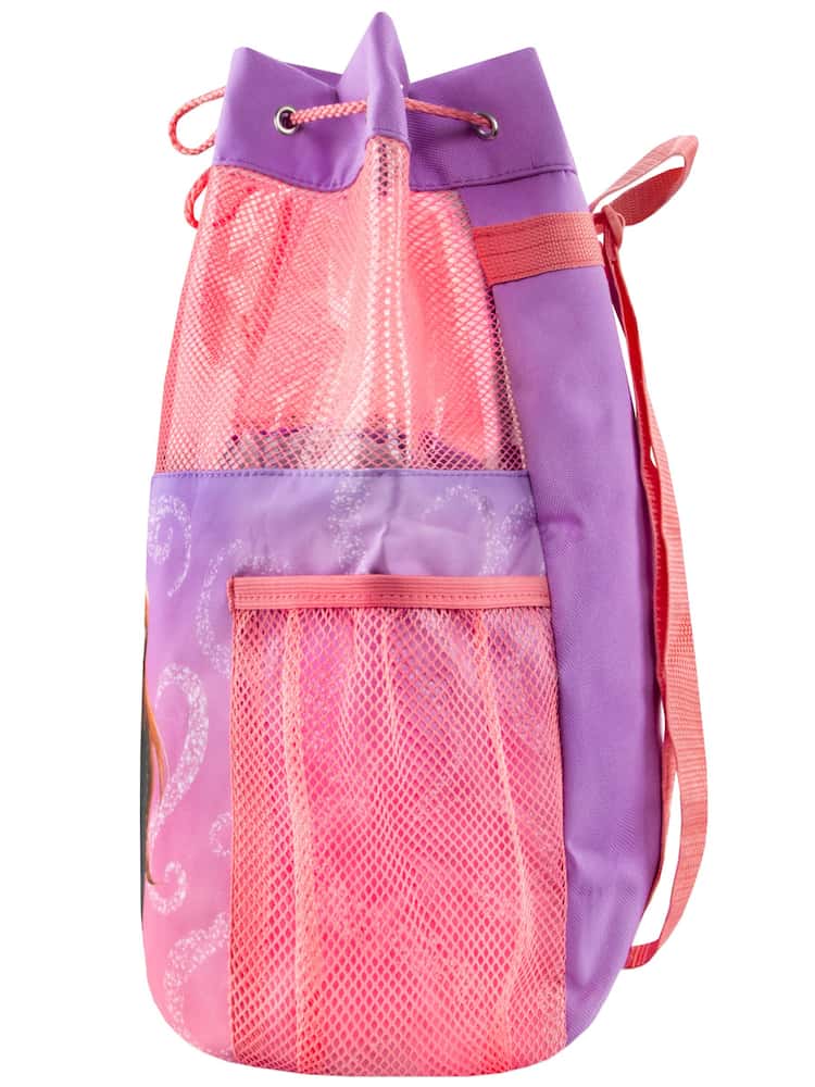Make every splash extra magical with this Frozen bag for the beach, pool, swimming and back to school. Designed for toddlers and preschoolers, this fun and practical Frozen swimming backpack features a vibrant purple and pink design with sisters Anna and Elsa smiling and holding each other, surrounded by playful swirls on the front. Perfect as a kids swimming bag, pool bag, or kids beach bag, this lightweight drawstring backpack is easy for little ones to carry to lessons, holidays, or sleepovers. The roomy main compartment fits swimwear, a towel, goggles, and snacks, while the mesh lining of this swim bag kids will love, helps with airflow after a busy day at the pool. With adjustable shoulder straps for a comfy fit and a handy side mesh pocket for water bottles or sunscreen, this girls drawstring bag blends style and function beautifully. Whether used as a Disney backpack for school, a Frozen backpack kids will love, or a beach-ready essential, this Elsa Disney backpack adds sparkle to every adventure.