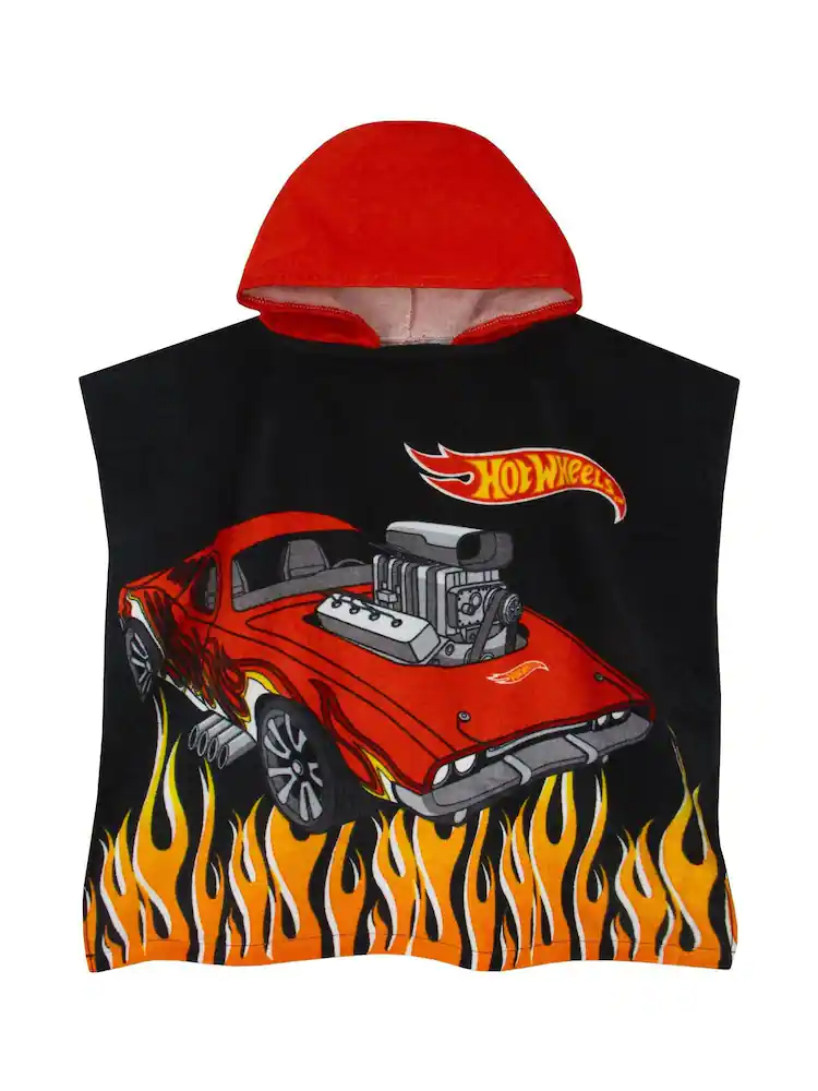 Fuel up for splash time with this blazing Hot Wheels kids towel poncho – the ultimate way for little speedsters to dry off in high-octane style! This black towel poncho kids will love features a bold design of a fiery red Hot Wheels car, racing through a wall of orange and yellow flames, with the iconic Hot Wheels logo riding above. The dramatic flame graphic rises from the hem, giving this kid’s swimming towel some serious turbo-charged energy. Topped off with a bright red hood, the towelling poncho keeps your little racer warm and dry after every splash, dash, and dip. Crafted from 100% soft cotton, this hooded towel is gentle on skin, absorbent, and perfect for Hot Wheels bath time, beach days, and poolside fun. As official Hot Wheels merchandise, it’s a winning pick for any young fan of Hot Wheels car toys and Hot Wheels accessories. Whether it’s a kids poncho for birthdays, Hot Wheels swimming towel for holidays, or fun poncho towels for kids. This is hooded towels for kids will never want to take off!