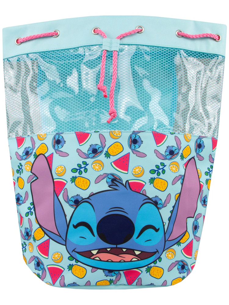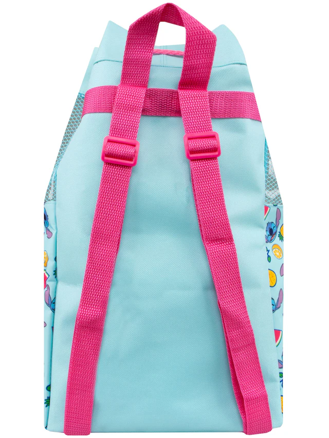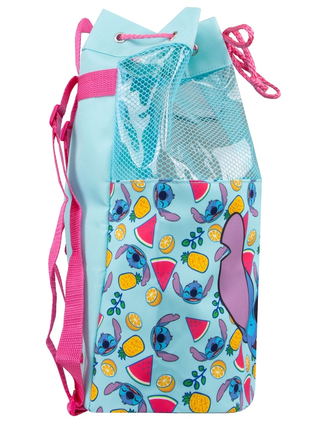 The vibrant pattern of watermelons, pineapples, lemons, and Stitch faces sets the tone for a playful summer. The drawstring closure ensures that their Stitch swimming costumes and towels stay securely tucked away, while adjustable straps make it easy to carry, promising comfort and style for every young explorer.