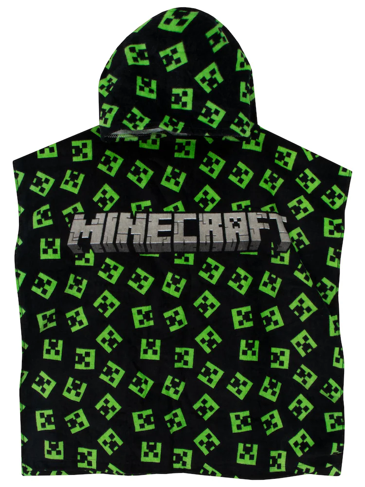 Beach-Ready Fun: Perfect for pool or beach days, this poncho is complete with a hood and showcases the bold Minecraft logo on the front.Dive into fun with the Kids Minecraft Towel Poncho, a must-have for young gamers! This eye-catching towel flaunts a playful pattern of the iconic Creeper faces in vibrant green set against a sleek black background. The bold Minecraft logo emblazoned on the front adds an extra touch of gaming flair. Designed with a handy hood, it’s ideal for keeping cosy and dry after a swim, making beach and pool days even more exciting.