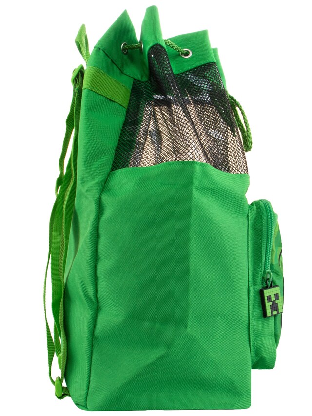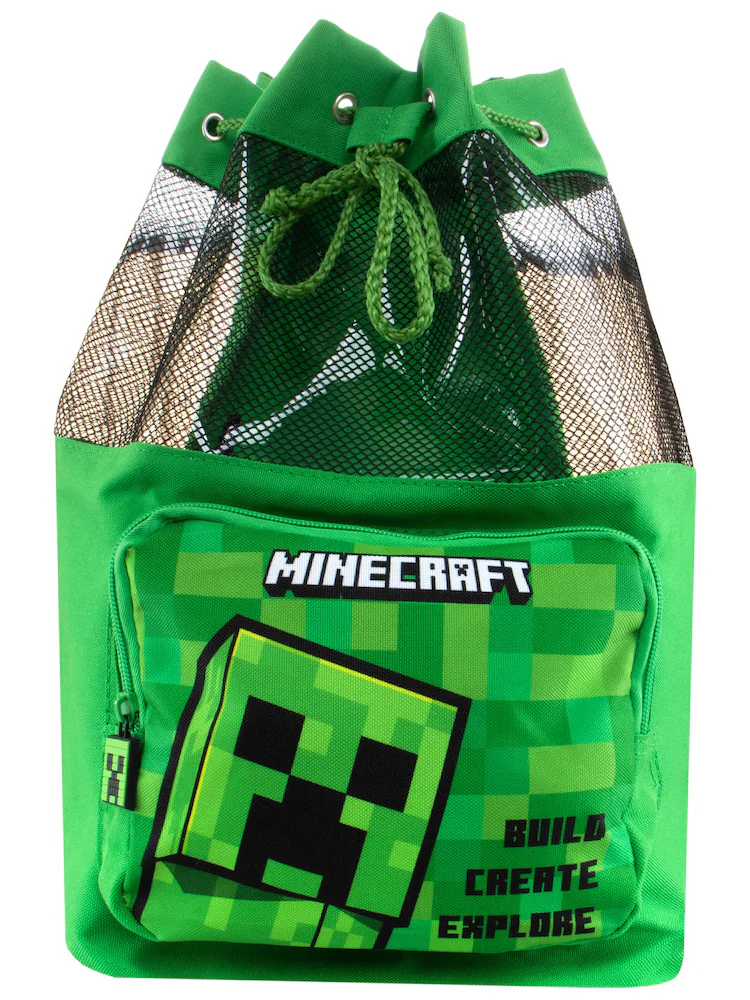 The zipper pull even takes the shape of a creeper, adding a delightful touch of authenticity. With ‘Build, Create, Explore’ and the Minecraft logo proudly displayed, this backpack is perfect for swim days.