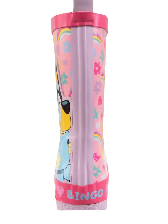 Featuring a vibrant design of Bluey and Bingo alongside cute designs of rainbows, flowers and hearts, these pink rain boots for kids are perfect for any young fan of the TV show Bluey.