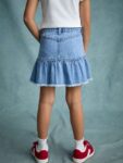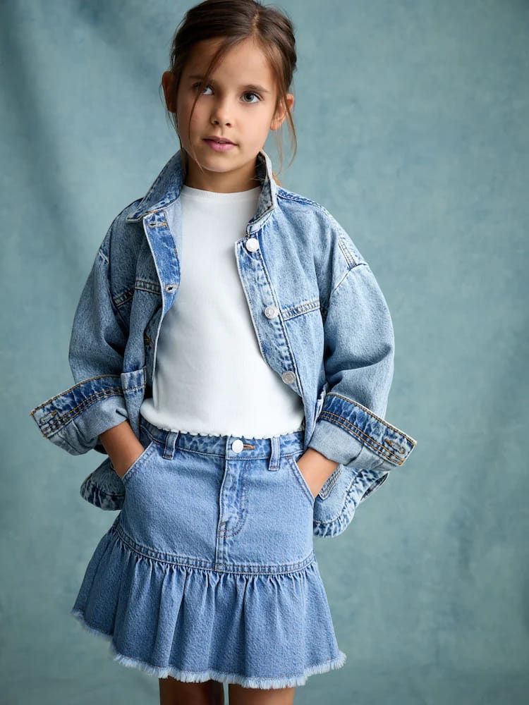 You can’t beat a denim skirt. This shirt is made from pure cotton in a rigid denim fabric, featuring a pretty frill bottom with a raw hem, an inner adjustable waist for the perfect fit, a button and zip fastening and a mid-blue wash.
