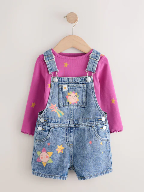 Perfect for playtime, this three-piece dungaree set is a fun and functional outfit. The denim dungarees feature a charming, embroidered cosmic scenery, while the long-sleeved top and striped tights add a pop of colour. This is a complete outfit for a happy time at home or when visiting friends to play.