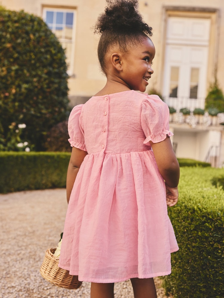 Make her feel like royalty in this beautiful Pink Flower Corsage Dress, an ideal outfit for flower girls and special events. The bodice features a pretty 3D flower detail, adding a delicate, charming texture. For comfort and ease, the dress is fully lined and secured with practical buttons at the back, creating a timeless and elegant look.