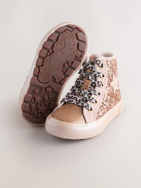 Make every step a sparkling one with these Star High Top Trainers. Perfect for a party or special occasion, these trainers feature an eye-catching design with glittery details and a star motif. For a different look, they come with two sets of laces. The slip-resistant and durable sole ensures a safe and steady stride, while the convenient inside zip makes them easy to put on and take off.