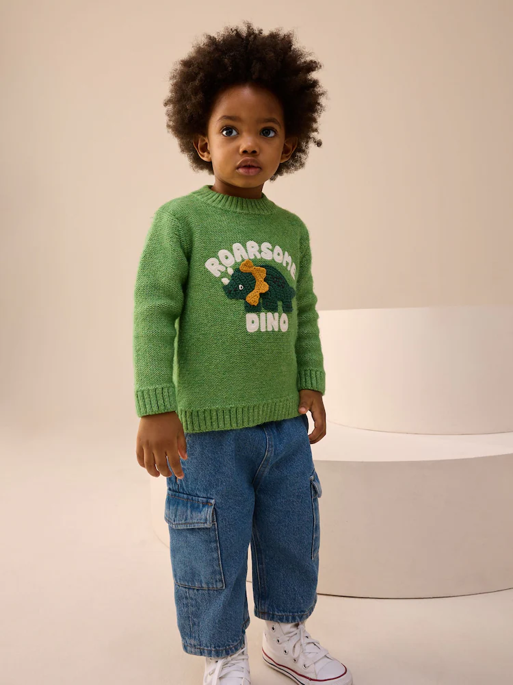 Make his look roarsome with this fun dinosaur knitted jumper, perfect for cosy casual wear and all his adventures. The vibrant green colour and playful dinosaur design ensures he stays warm while showing off his bold style.