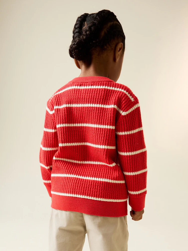 This vibrant red and ecru knitted stripe jumper is a comfortable and stylish addition to his wardrobe. Made from soft touch VPN yarn, the cosy knit and classic stripe pattern provide a warm feel for cooler days. The Henley neck shape with button fastening makes it a versatile layering piece for any casual outing.