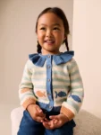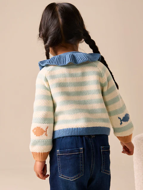Introduce a charming, playful layer to the wardrobe with this Light Blue Collared Fish Stripe Cardigan. This cosy piece features a classic Collared cardigan shape and a cheerful stripe design with fish detailing. The knit is perfect for comfortable layering over dresses or tops.