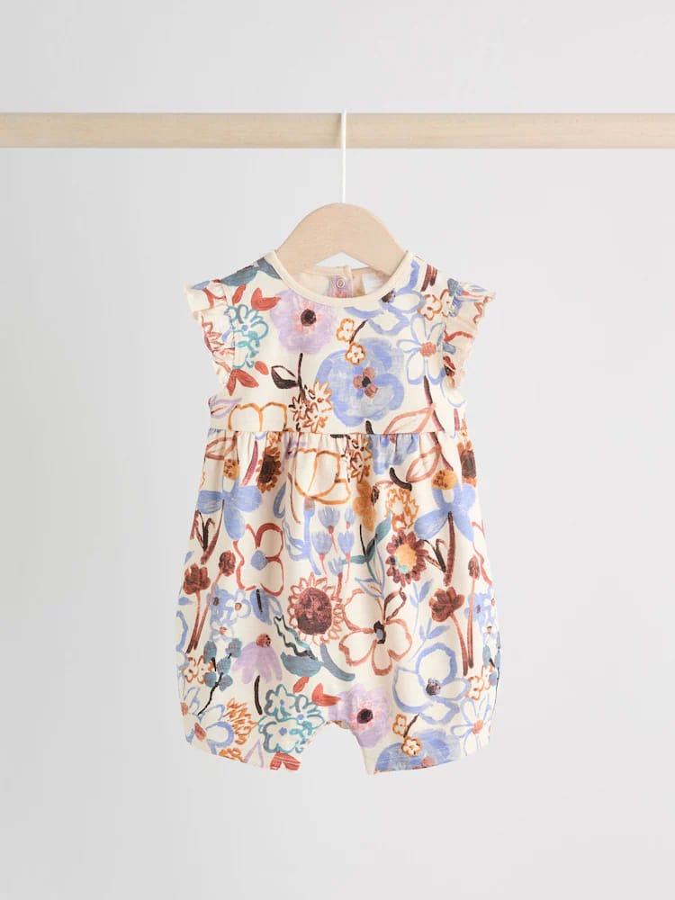 This sweet Printed Rompers 3 Pack is a charming collection of warm-weather outfits. The rompers feature a fun printed design and playful frill shoulder detail. The designs include a wadded character detail on one of the rompers, and all feature a convenient popper back neck and popper leg opening for easy changing.