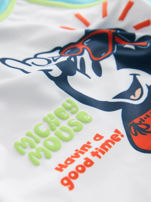 Add some fun to their swimwear, with this 2-piece set. With licensed Mickey Mouse graphics, the set features a short sleeve rash vest with a zip fastening to the back of the neck on sizes 3-6 month to 1.5-2 years. A pair of coordinating shorts are finished with an elasticated waistband.