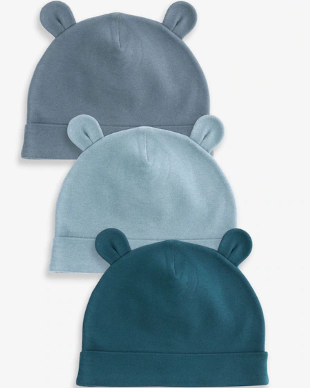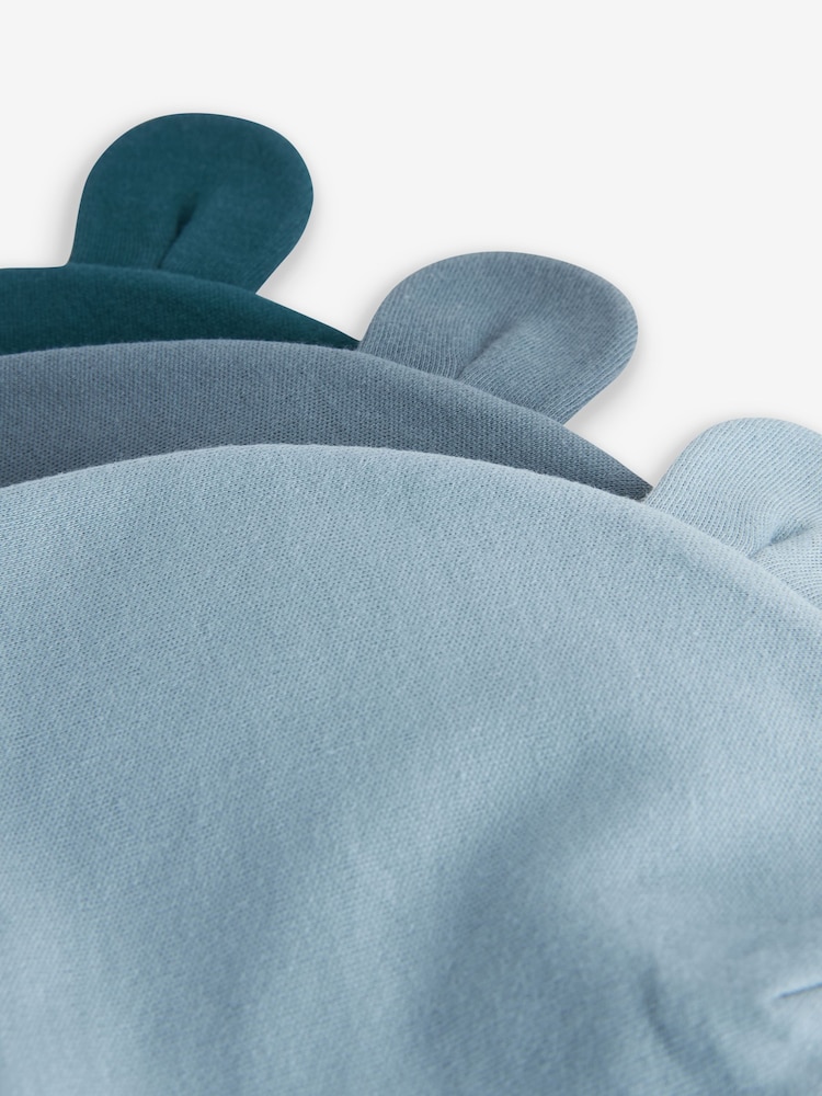 This set of 3 beanies have a cute 3D ear design, made from pure cotton in tonal blue hues.