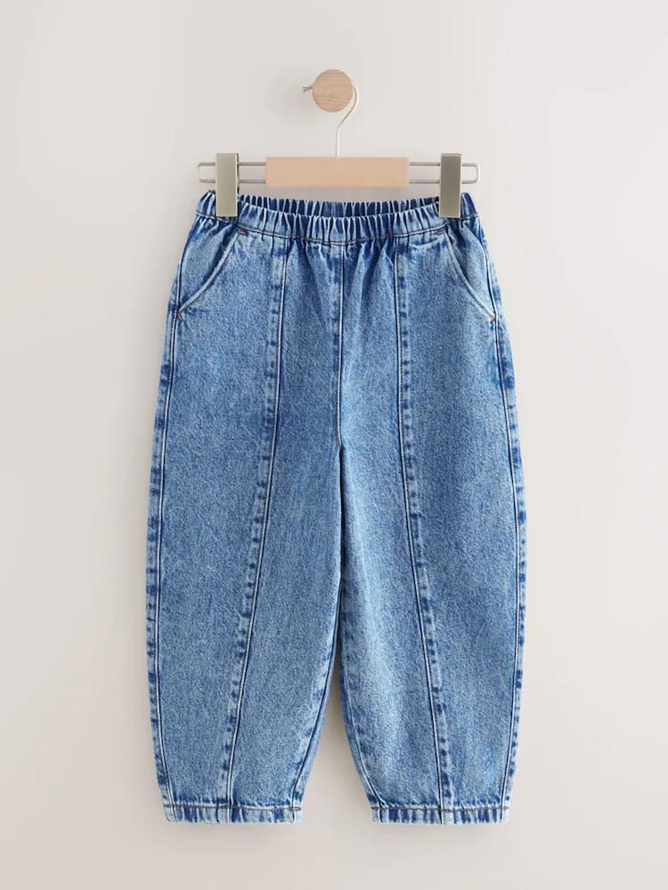 With an easy pull-on elasticated waistband, a pure cotton construction and a barrel leg shape, they’ll reach for these ultra cool mid blue jeans again and again, finished with an adjustable drawstring fastening, front seam detailing and side pockets.