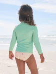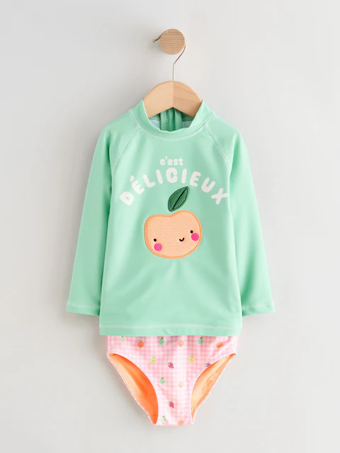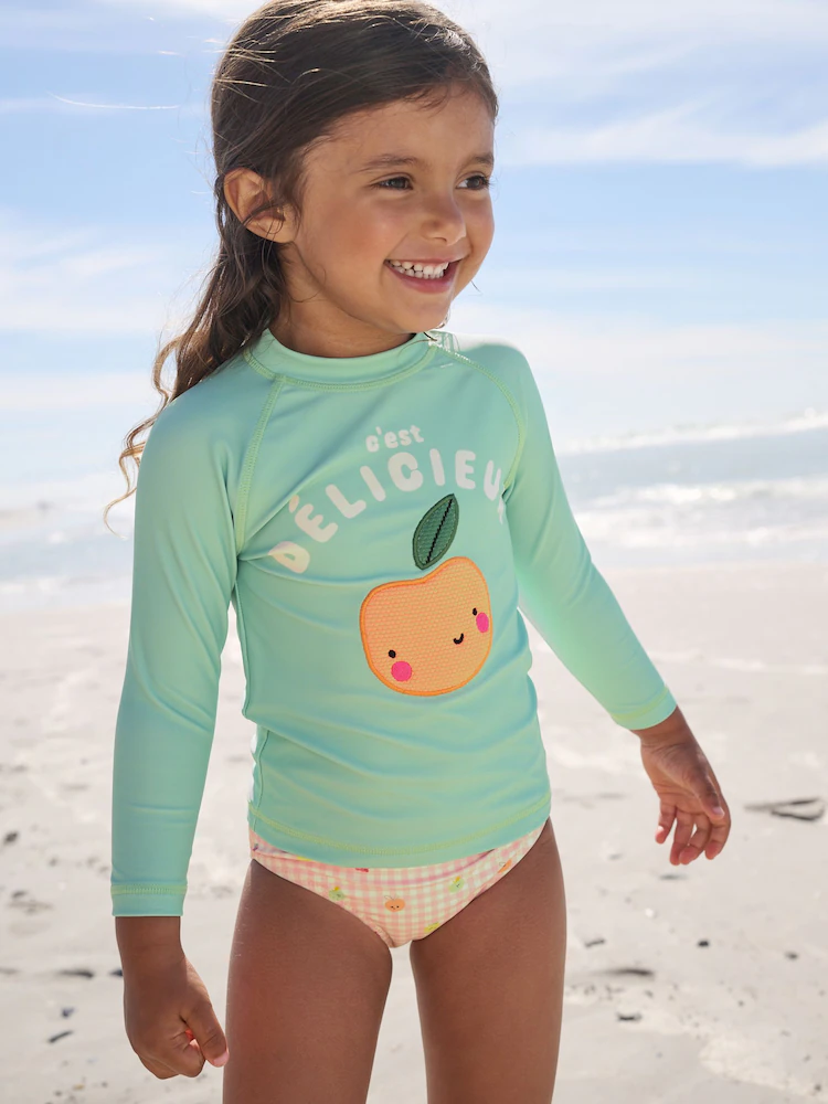 This long-sleeve sunsafe swimsuit features an all-over print of whimsical designs. Designed for beach and pool days, the fabric provides a UPF rating of 50+ to help protect delicate skin from the sun.