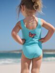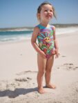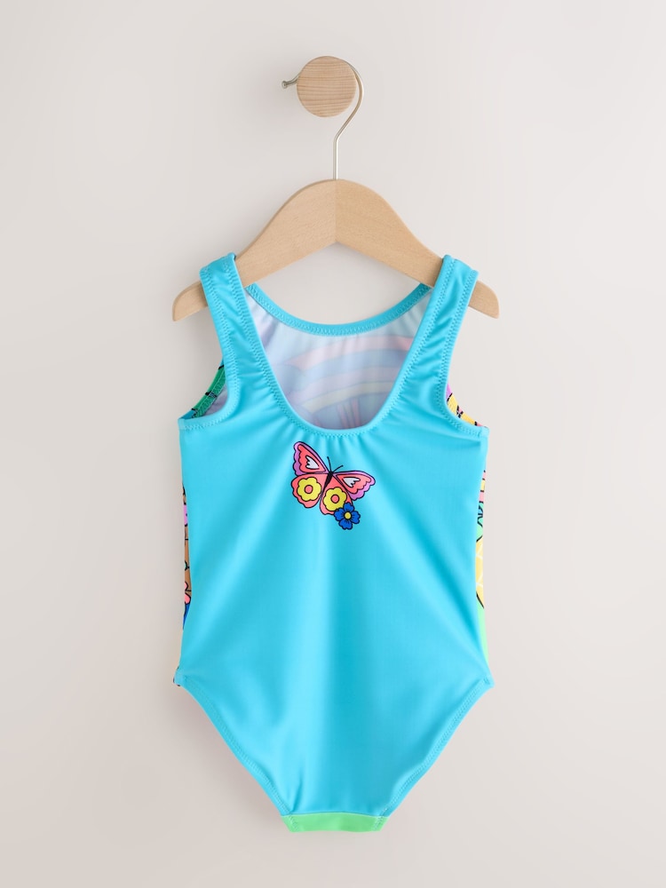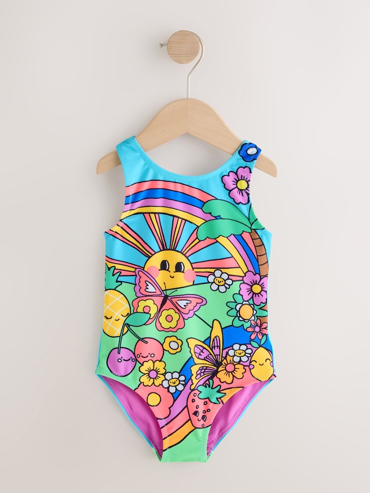 They’ll be ready for the water in this fun multi beach scene swimsuit. The super stretchy fabric and vibrant all-over print ensure a comfortable fit for all-day play. With a reversible plain blue side and a colourful print side, this swimsuit is perfect for holiday fun.