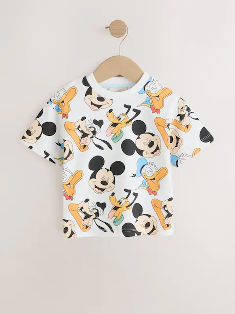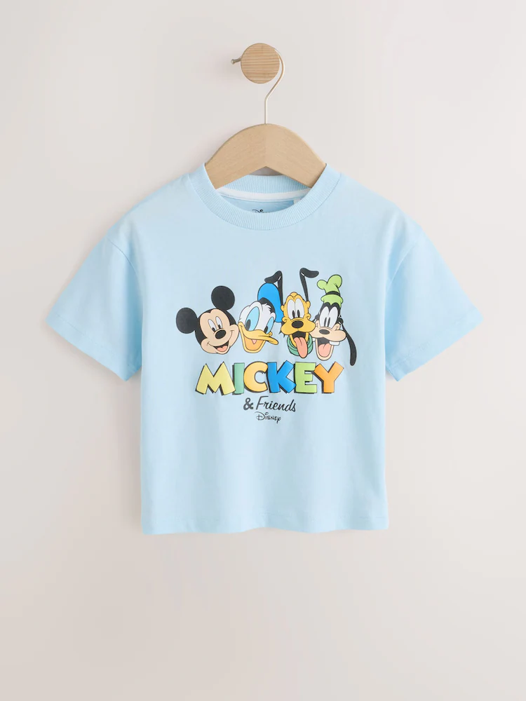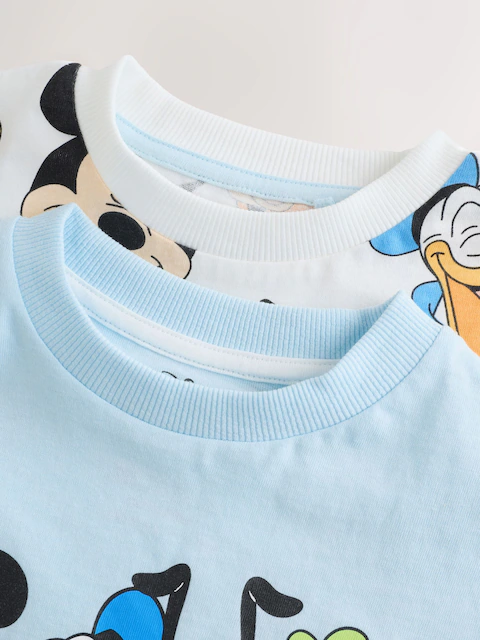 Add double the Disney magic to their wardrobe with this Mickey Mouse Short Sleeve T-Shirts 2 Pack. This set features two distinct, officially licensed designs crafted for comfort and style. The first tee is a crisp white featuring a vibrant all-over print of Mickey, Donald Duck, Pluto and Goofy. The second is a light blue Mickey and Friends shirt, showcasing the iconic four characters above colourful 3D-style MICKEY & Friends typography.